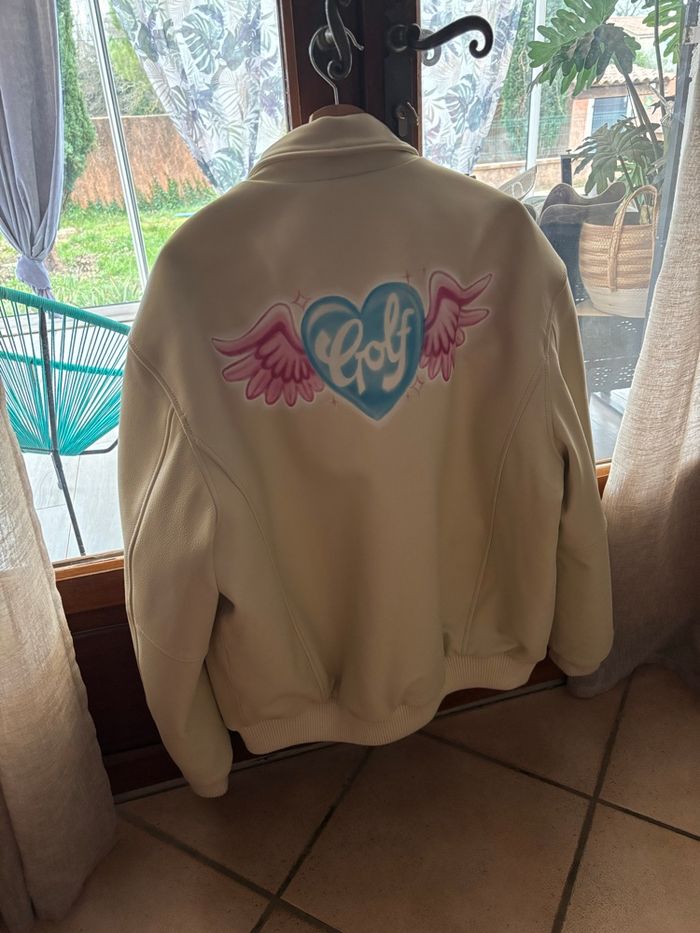Blouson golf Wang by Tyler the creator , 100% vrai cuir comme indiqué sur l’étiquette , jamais porter et authentique , plus disponible depuis un long moment sur le site Je l’ai eu dans les pochette mystère golf Wang lors de la tournée chromakopia world tour Vrai cuir et matière d’excellente qualité donc la veste est assez lourde Prix négociable dans la limite du raisonnable J’ai mis autre en marque car la marque de Tyler n’existe pas dans les propositions mais elle est 100% authentique