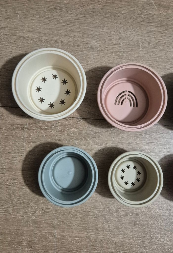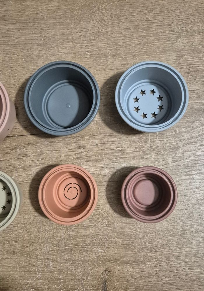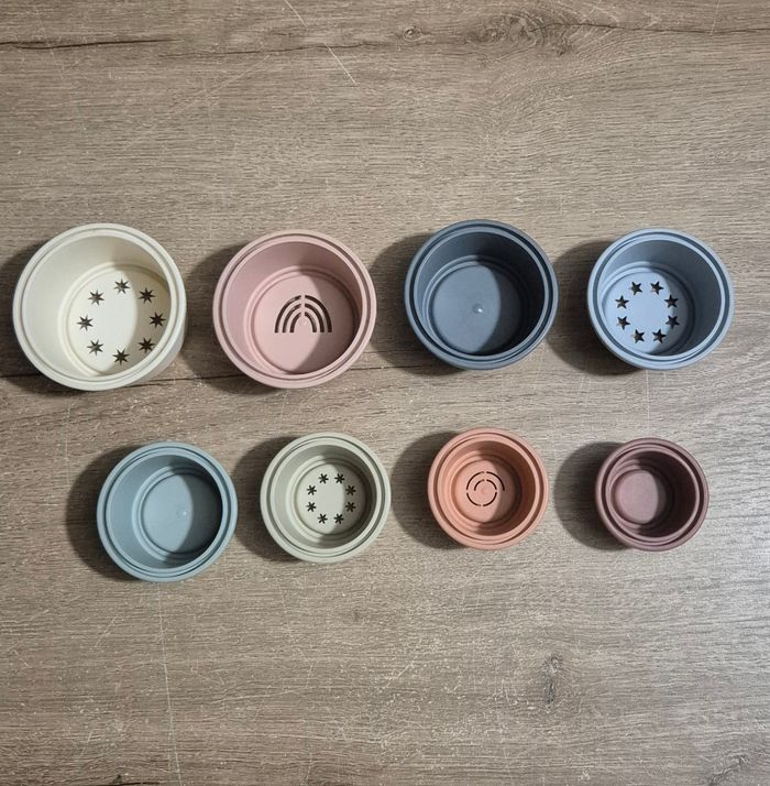 8 gobelets gigognes à empiler Servent de gobelets de jeux dans le bain, percés au fond Mushie Parfait état