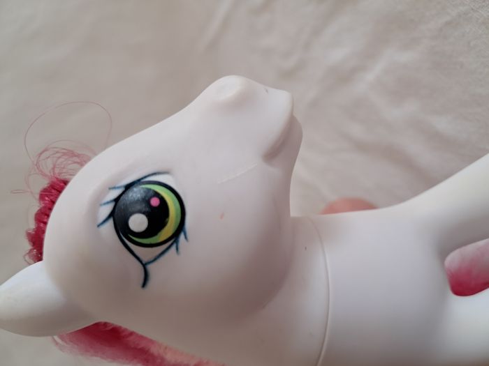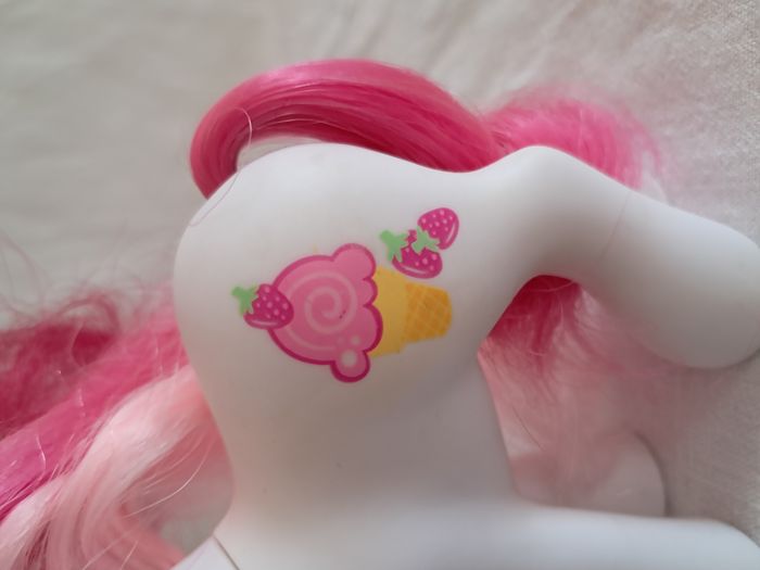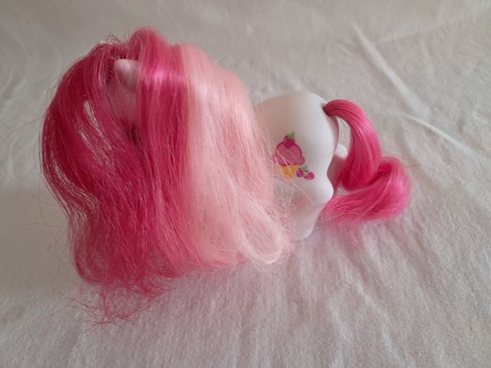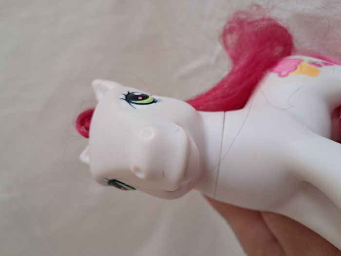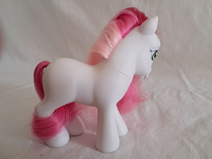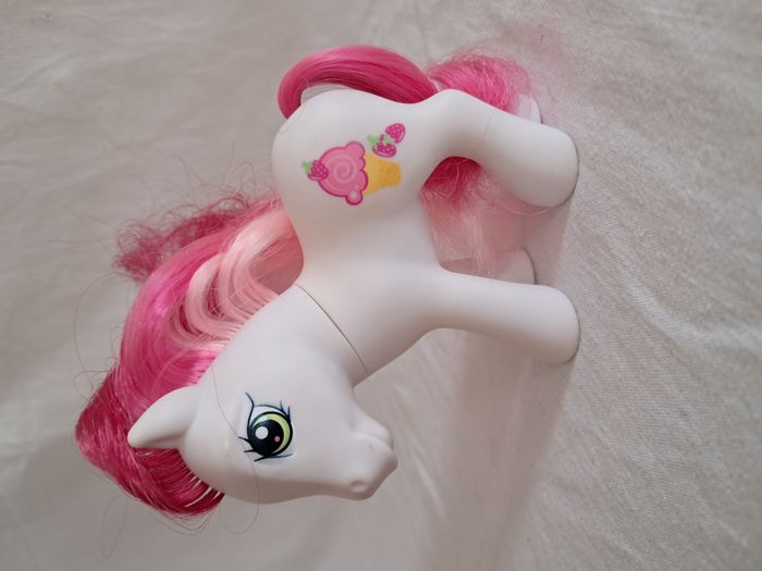 My little pony G3 Strawberry surprise Hasbro 2006 Made in China Hauteur : 10,5 cm Poids total : 62 grammes Bon état Petites taches et griffure sur les museaux Utilisé, peut présenter des défauts tels que des marques, des taches, des coupes de queue et des cheveux. voir photos.