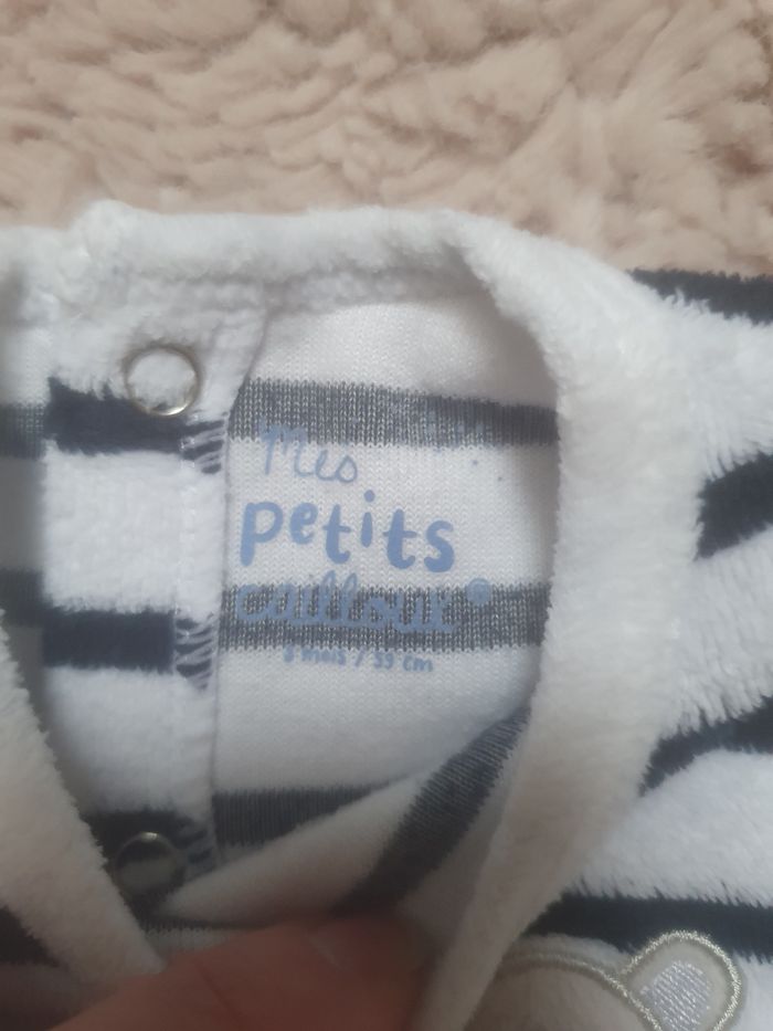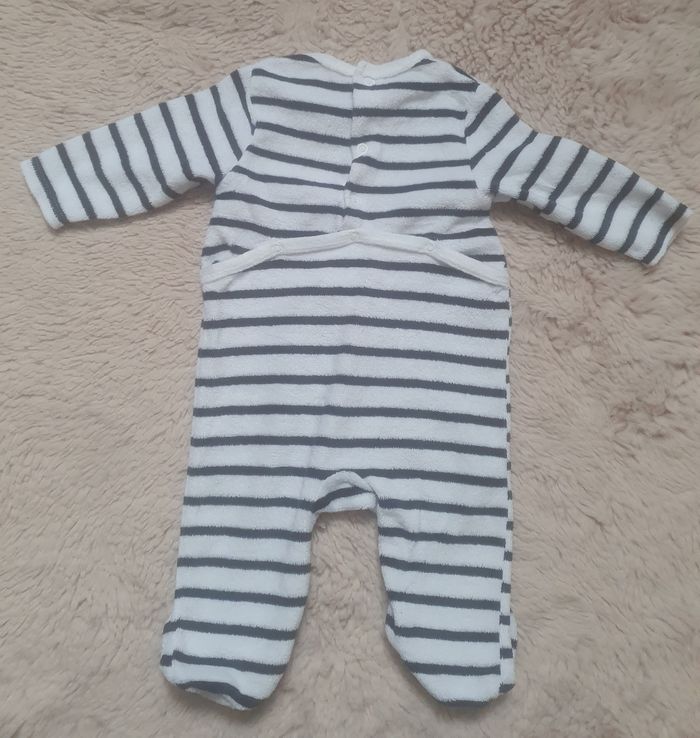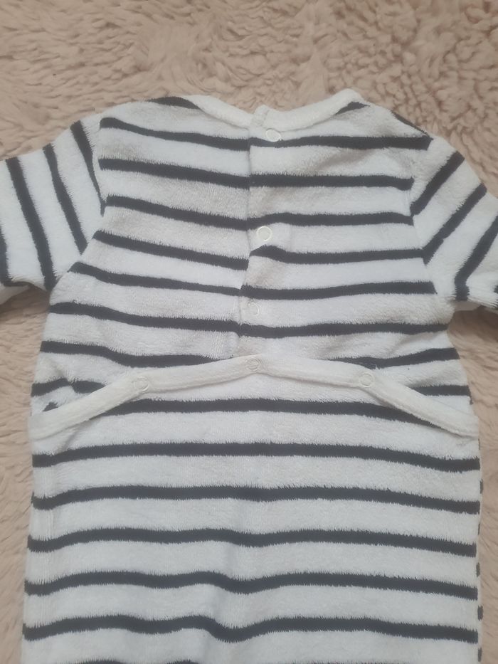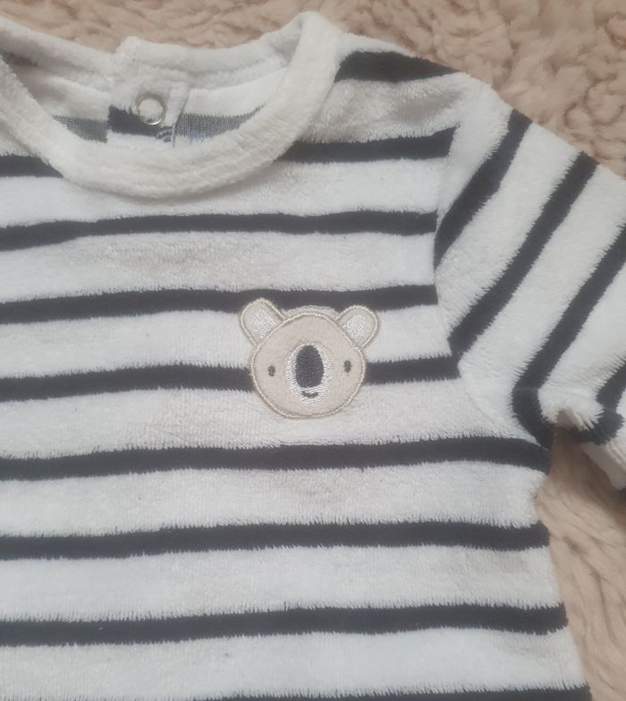 Pyjama en velours, pressions à l'arrière. Imprimé type rayures marinières et petit motif koala. Taille 3 mois 59cm inscription. Très peu porté, lavé à 30 degrés et désinfecté. Pas de tâches ni de trous, parfait état. #pyjama3moismixte #pyjama3moisgarçon #pyjamabebegarcon3mois #pyjamamespetitscailloux3mois #mespetitscailloux3mois #pyjamagarcon3mois #pyjamabebegarcon3mois
