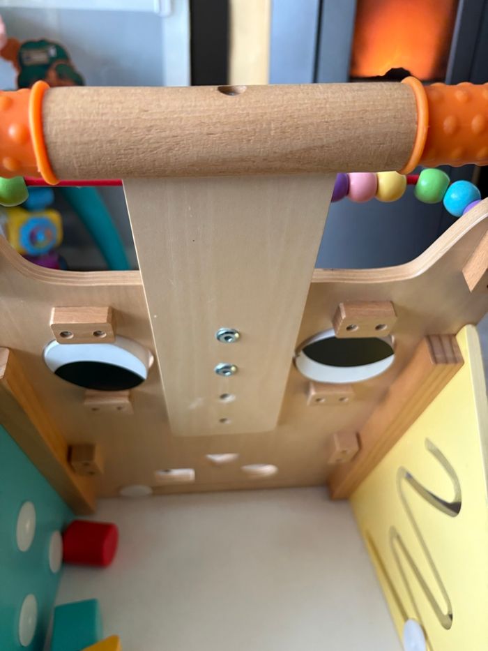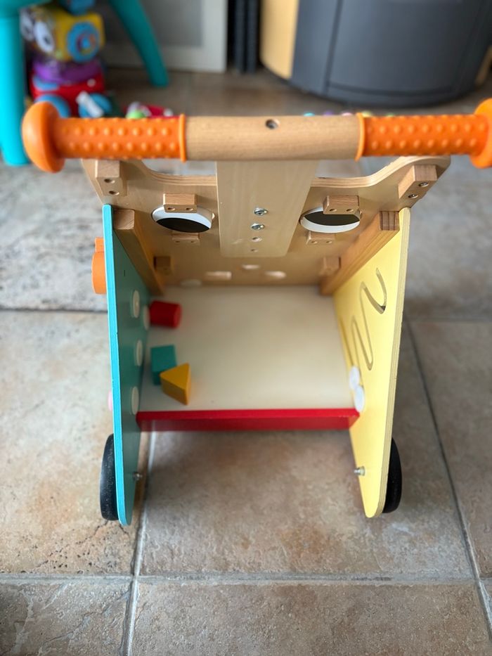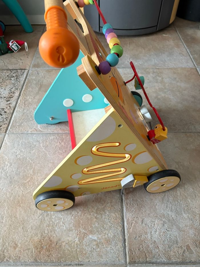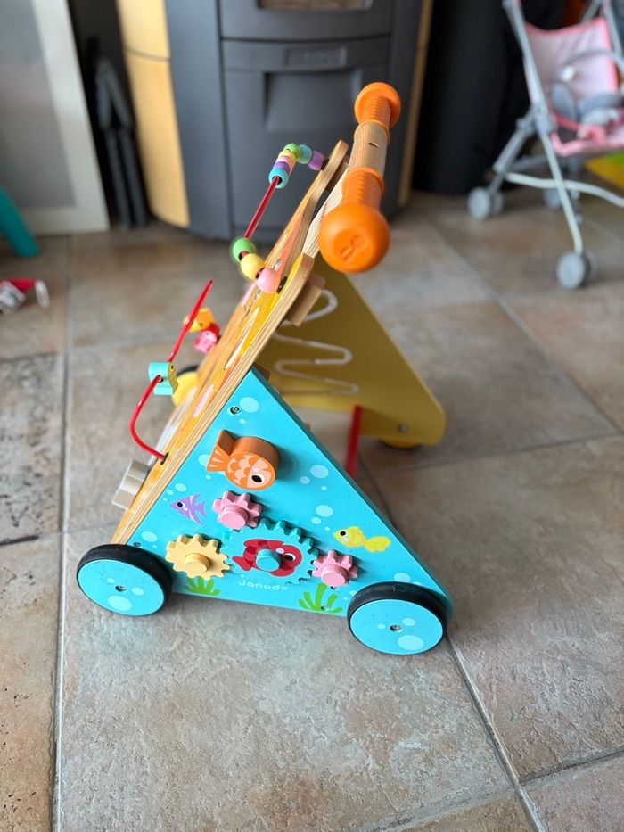 Chariot de marche d’apprentissage. Excellent état marque JANOD. En bois avec tous les accessoires. Top car réglable en hauteur (cf photo) et les roues peuvent s’adapter en vissant ou dévissant pour adapter la vitesse