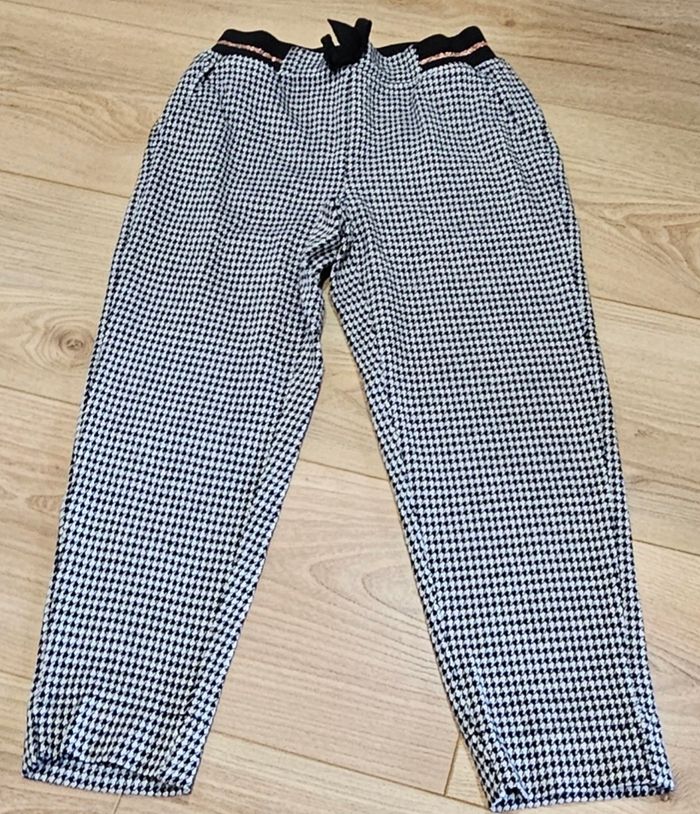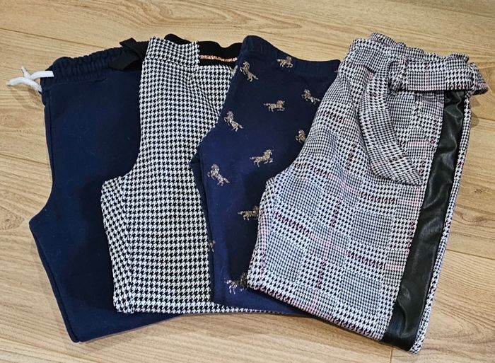 Lot de 4 pantalons fille - 1 pantalon à carreaux avec bande effet cuir : Marque INEXTENSO. Taille 5 ans. - 1 legging bleu marine avec motifs chevaux dorés : Marque KIABI. Taille 5 ans. - 1 pantalon noir et blanc avec flot : Marque INEXTENSO. Taille 5 ans. - 1 pantalon (type jogging) bleu marine : Marque PRIMARK. Taille 5-6 ans. Très bon état sauf le legging à motifs chevaux dorés (usure au niveau des genoux et des fesses).