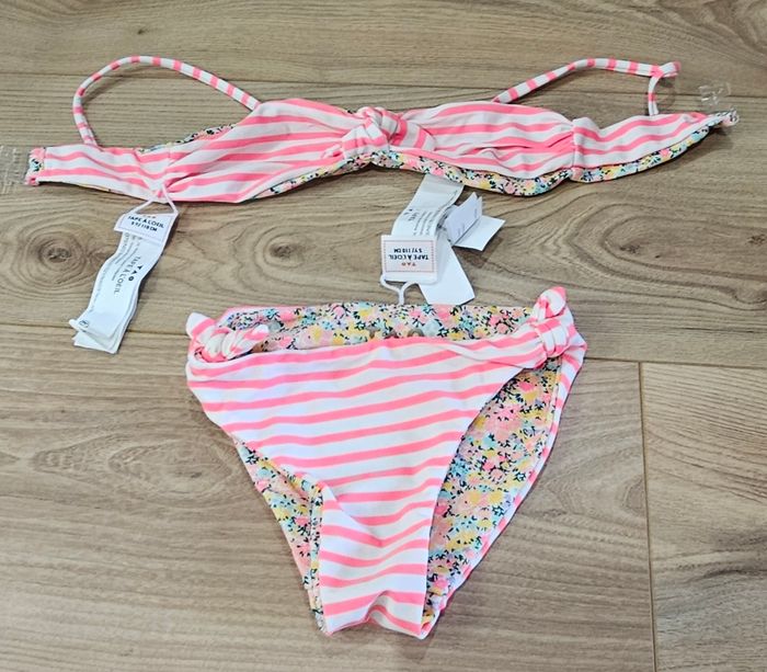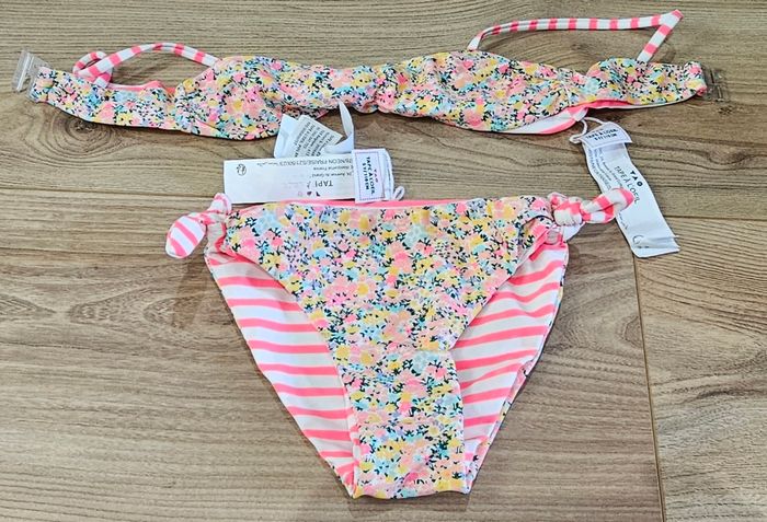 Maillot de bain réversible (1 côté fleuri et 1 côté rayé rose/blanc). Marque : Tape A l'Oeil. Taille 5 ans. Neuf jamais porté.