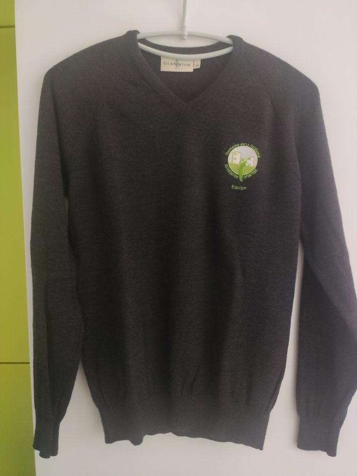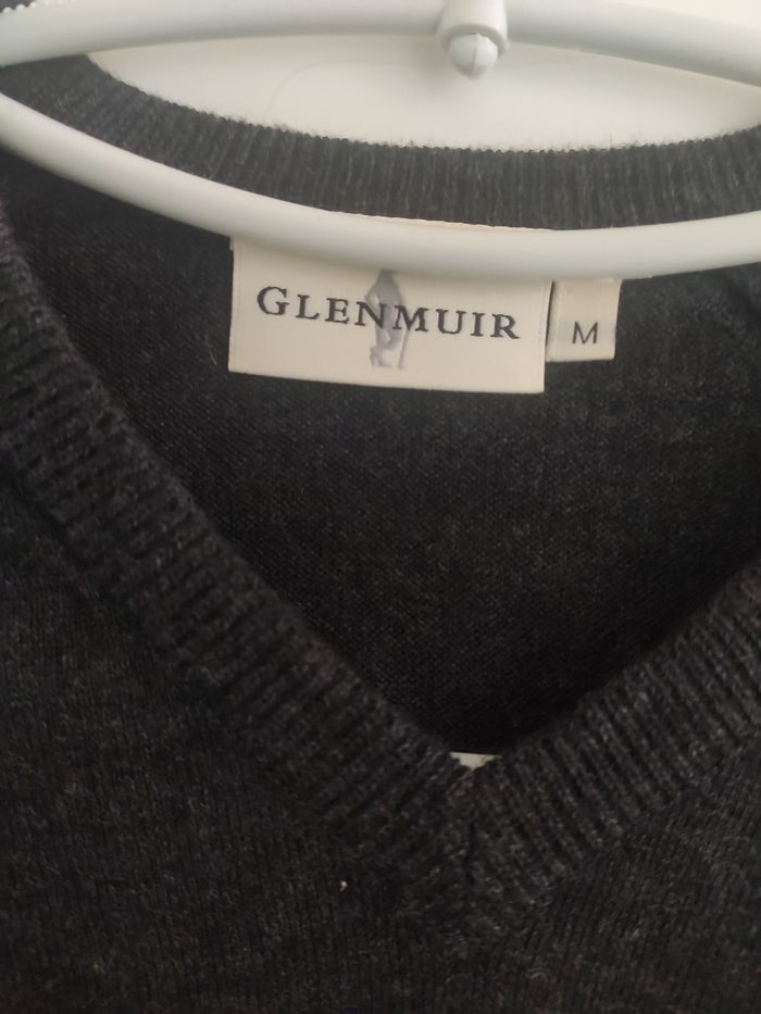 Un pull chiné gris foncé avec col V en pure laine Woolmark. Très peu mis, très bon état, logo sur la poitrine et sur la manche. Taille M. Marque Glenmuir #vulariFemmesM38 #glenmuir #lainewoolmark