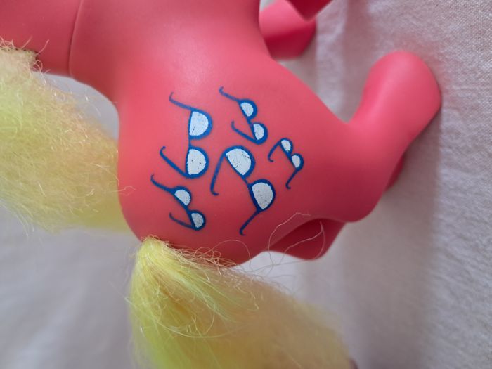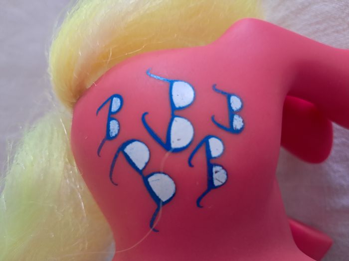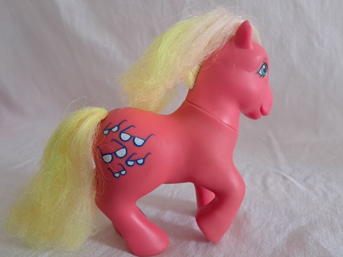My little pony G1 Shady (lunettes) Hasbro 1985 Made in Hong kong Pat pend Hauteur : 13 cm Poids : 85 grammes Bon état Manque sur les motifs Une oreille abimée Crinière et queue rêches et je pense coupées Utilisé, peut présenter des défauts tels que des marques, des taches, des coupes de queue et des cheveux. voir photos.