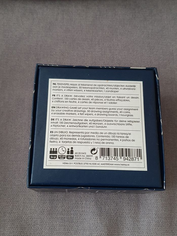 Jeu It's a Draw acheté chez Hema, jamais utilisé, complet. Une petite marque sur au dessus du logo Hema sur la boîte (voir première photo) et quelques traces dans le couvercle de la boîte de jeu malgré tout (voir dernière photo). Le but du jeu : Dévoilez votre mission/objet en faisant un dessin. Contient 150 cartes de dessin, 40 pièces, 4 feutres effaçables, 4 chiffons en feutre, 4 cartes de réponse et 1 sablier. Je vends aussi le jeu Who is Who acheté chez Hema, du même format.