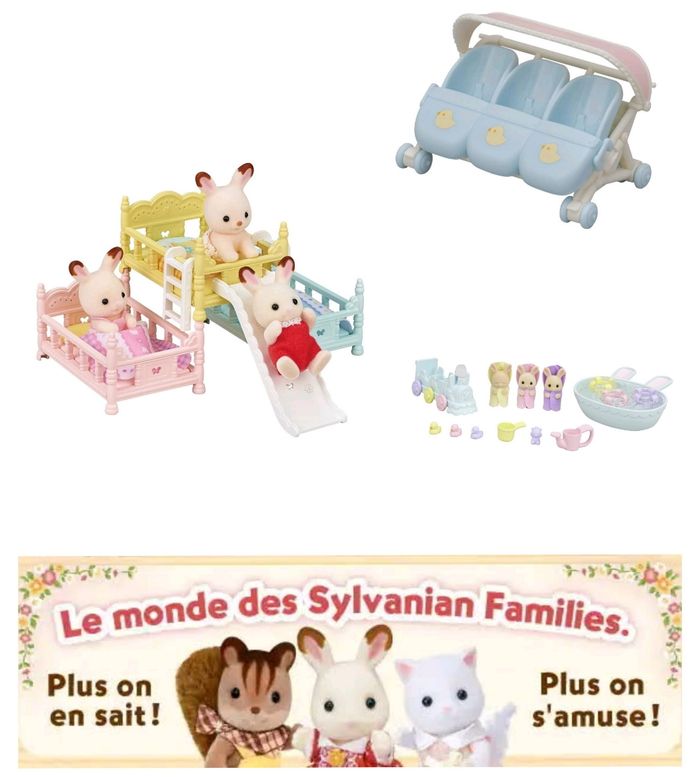 SYLVANIAN FAMILIES PACK "FAIRE COMME LES GRANDS" 4/9 ANS. MIXTE- Un adorable Pack Sylvanian qui permet aux enfants de laisser parler leur imagination et créer de beaux scénarios imaginaires, il contribue à l'apprentissage du quotidien et l'expression des sentiments. - SET 5707 : LES TRIPLÉS LAPIN CRÈME ET ACCESSOIRES DE BAIN. Imitez le rituel de l'heure du bain ! Chaque triplé Lapin Crème est emmitouflé dans une couverture très douce, installez les bébés dans les bouées pour leur faire prendre le bain. Après le bain installez les triplés dans le petit train et , Via la chambre à coucher !.. - SET 5741 : LES LITS SUPERPOSÉS. Ces 3 lits superposés sont fournis avec 3 oreillers,3Couettes, 1 toboggan et 2 échelles. Les lits peuvent être empilés de plusieurs façons: côte à côte ou en forme de montagne. Les échelles et le toboggan sont amovibles et peuvent être placés n'importe où sur les lits. - SET 5533 : LA POUSSETTE TRIPLE. Idéal pour partir en balade ! C'est l'accessoire pour promener les triplés (ou 2 bébés Sylvanian , quand on enlève les cosys amovibles). Un auvent les protège du soleil et même de le pluie. Génial ! La poussette se transforme en siège auto pour la Voiture rouge ou le Monospace Sylvanian Families. À vous les merveilleuses aventures avec les bébés Lapin Crème !.. Emmenez vos triplés Lapin Crème voir le monde dans l' adorable poussette ! Les triplés adorent prendre le bain tous ensembles,c'est leur moment préféré de la journée ! Un moment de jeu et de détente avec leur jeux de bain ! L'heure du coucher devient une aventure spéciale, après une belle journée pleines de découvertes, les bébés peuvent se blottir dans les lits moelleux, pour une bonne nuit ou une belle sieste. PACK À 38 € Un cadeau idéal pour débuter ou compléter la Collection Sylvanian Families.