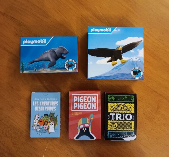 Lot de jouets macdo comprenant: - trio - playmobil - pigeon pigeon - playmobil - jeu de 7 familles Macdo