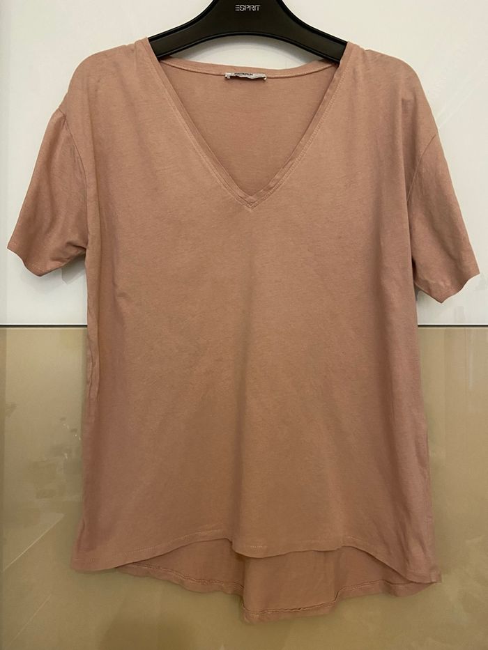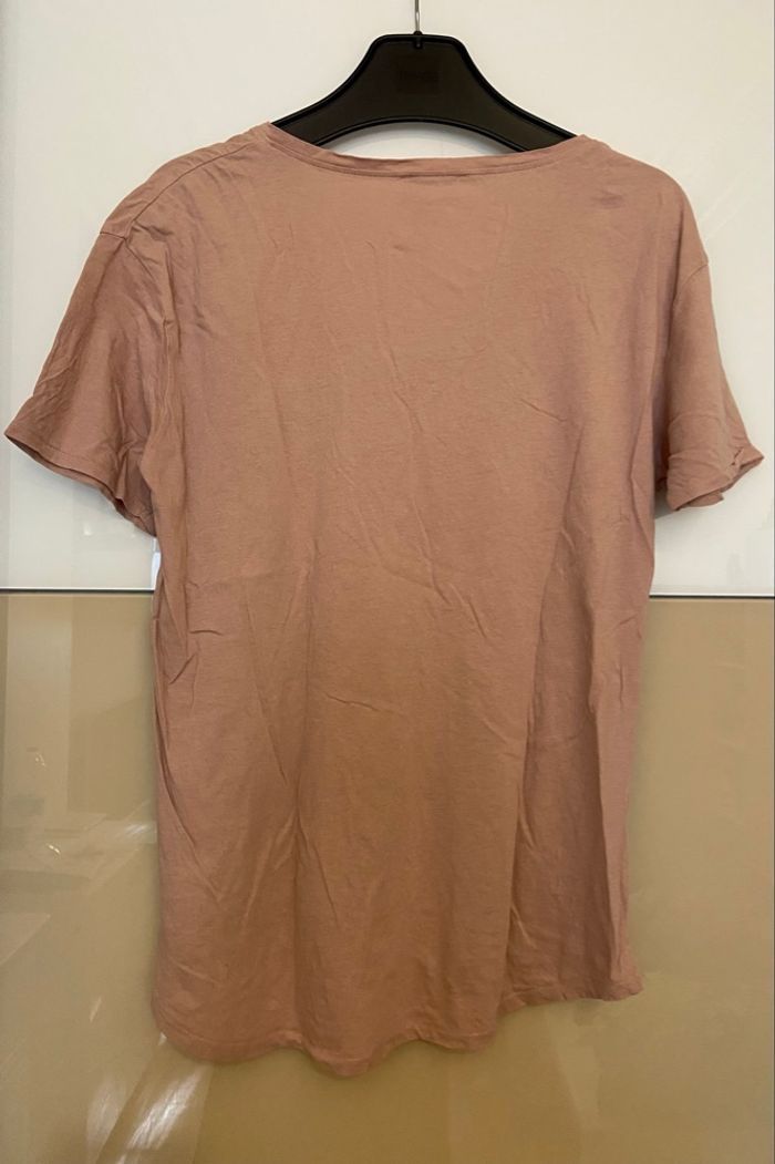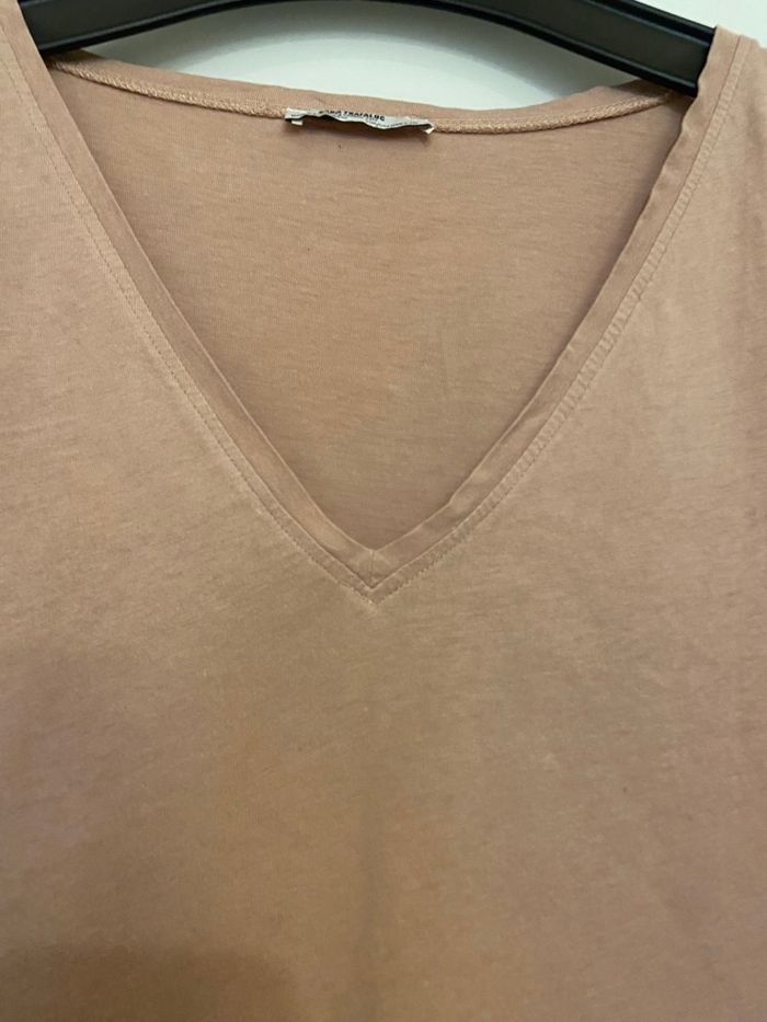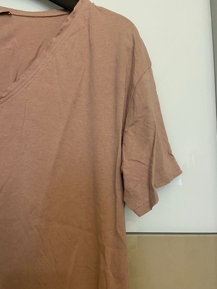 t-shirt long col V rose de la marque Zara. Taille : 36 - S Couleur : Rose Dimensions Épaules 42 cm Hauteur 75 cm