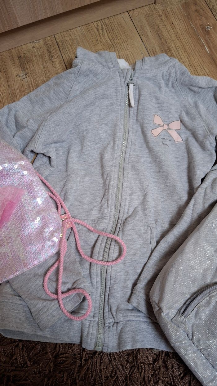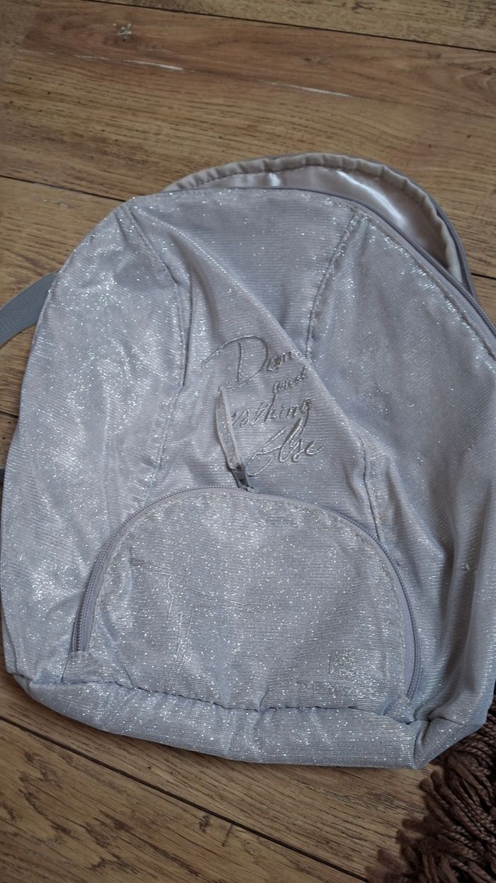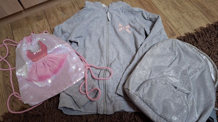 1 sac a dos argenté avec paillettes Pour la danse. 1 sweat donné car trou a la manche gauche 1 sac danseuse rose avec paillettes !!