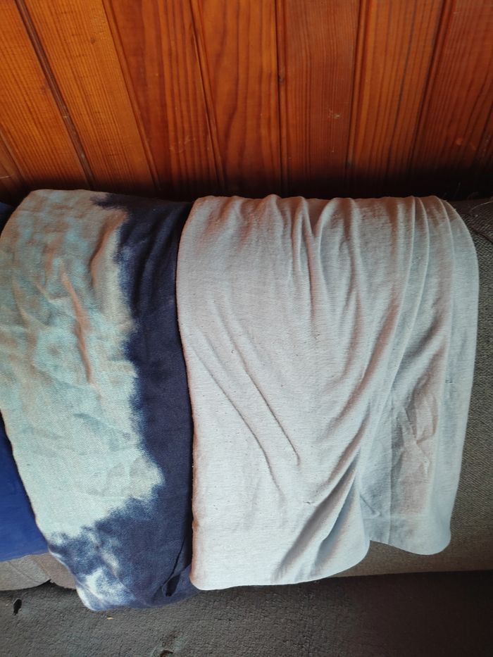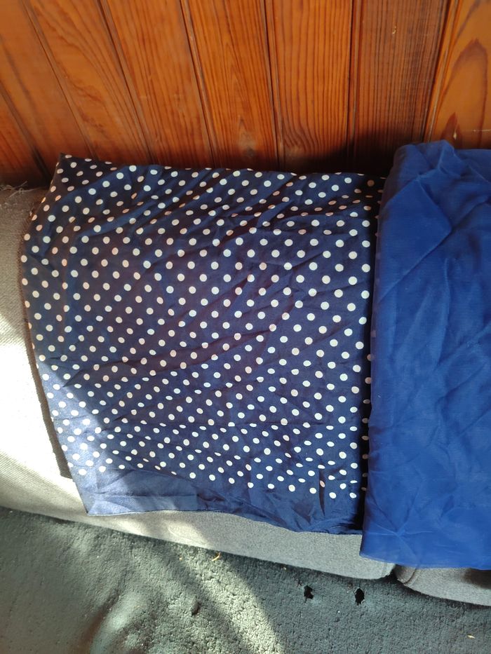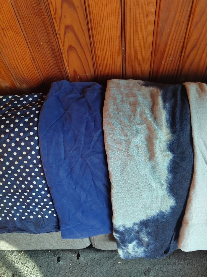 Lot 4 foulards et echarpes 1 carré marine à pois blancs 1 carré transparent bleu 1 rectangle long effet décoloré marine, bleu, rose 1 tour de cou grand bleu