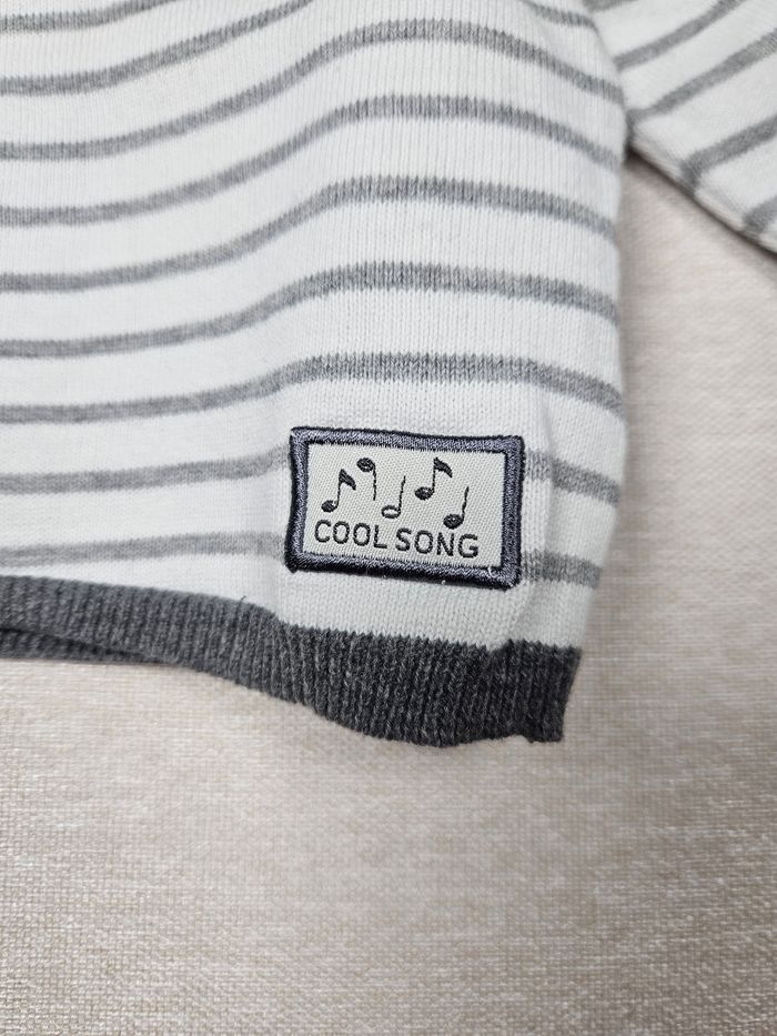 Hello ! 👋 Je te propose cette pièce de la marque Kiabi, une super trouvaille pour le dressing de bébé 👶 Un petit pull en maille fine à rayures avec un patch "Cool Song" pour un look musical et tout doux. Informations utiles: * 👕 Article : Pull en maille légère à rayures * 📏 Taille : 3 mois (56-62 cm) * 🌈 Couleur : Blanc et gris * 🧵 Matière : 100% coton * ✨ État : ⭐⭐⭐⭐ Les petits + : 🏡 Logement non fumeur et sans animaux. 📦 Envoi rapide et soigné. N'hésite pas si tu as la moindre question ou si tu veux d'autres photos ! Je suis là. 😉 #kiabi #3mois #pull #bebe #coton #rayures #gris #blanc #musical #tendance
