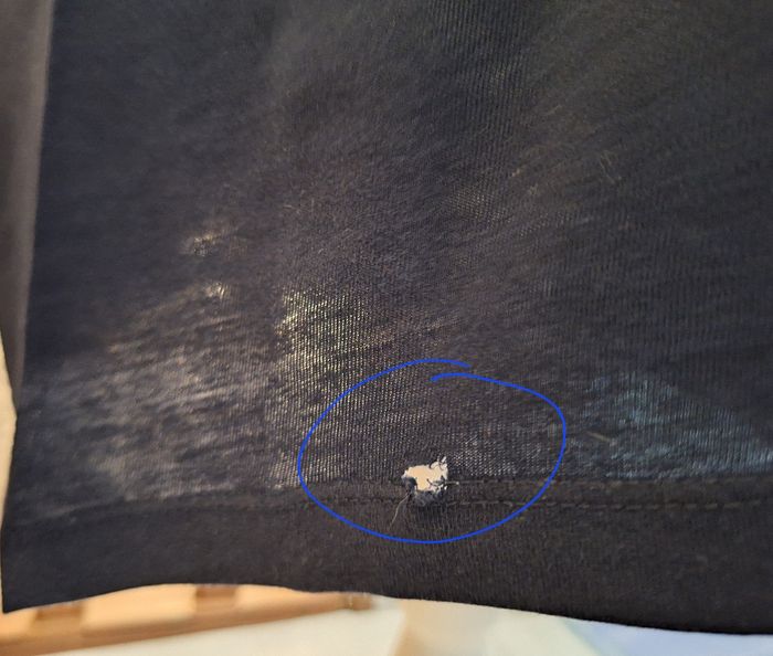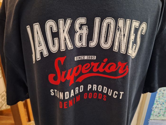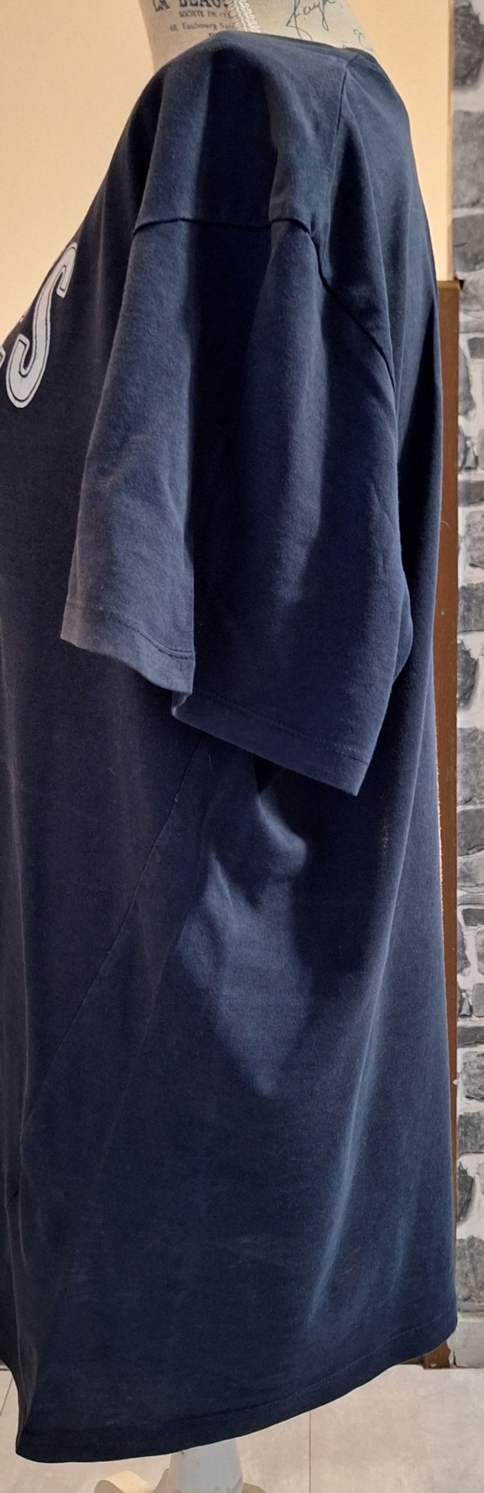 Tee-shirt bleu marine en 100 % coton, imprimé blanc et rouge devant. Un accroc sous l'imprimé et en bas devant.