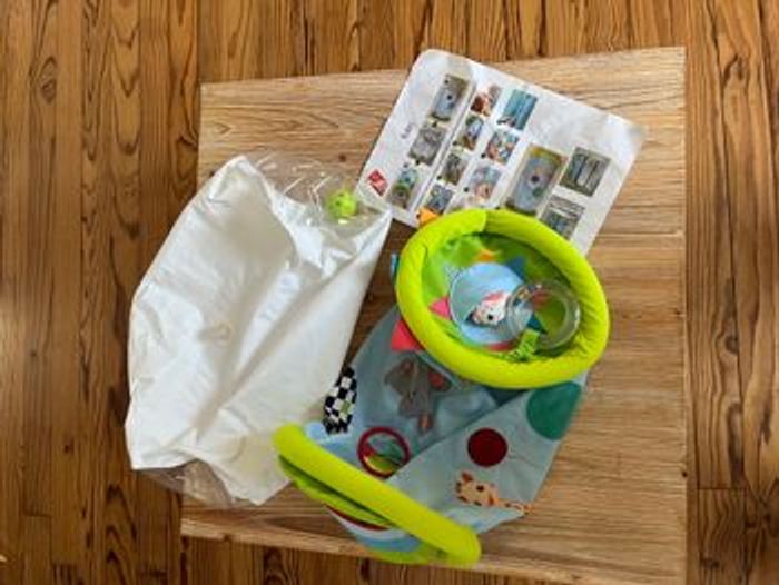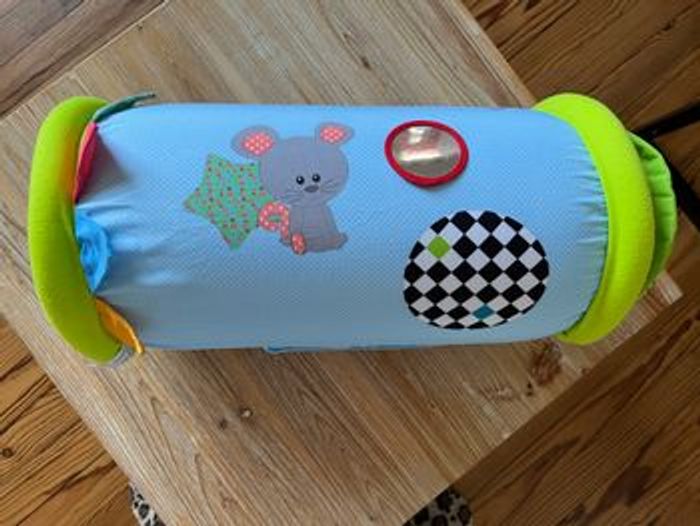 En très bon état, complet. Le miroir a un petit pli (voir photo 5) A partir de 6 mois. Rouleau à escalader, à faire rouler et à chevaucher pour développer la motricité et l'équilibre de bébé. Il se transporte partout ! Allongé, assis, ou debout bébé s'amuse avec le rouleau en toute sécurité grâce à ses rebords molletonnés. Housse en tissu amovible et lavable apporte confort et douceur. Plusieurs activités à découvrir pour éveiller les 5 sens de bébé : miroir, balles sonores, papier froissé, anneau, hochet... Léger et rapide à gonfler, il est facilement transportable. Conseil d'entretien : lavable en machine à 30° Prix neuf 23 €