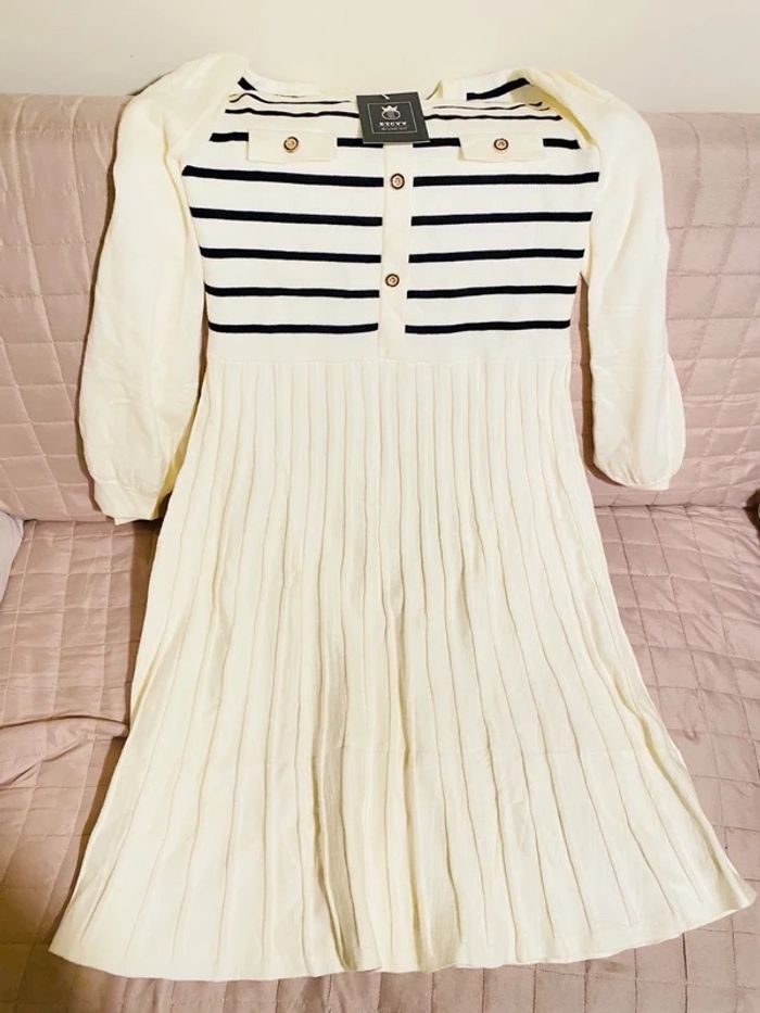 Robe pull blanche achetée aux États-Unis. taille M . Très belle. Mais correspond plutôt à la taille L en France. Tissus épais, parfait pour l’hiver ❄️.
