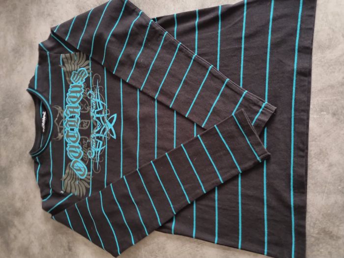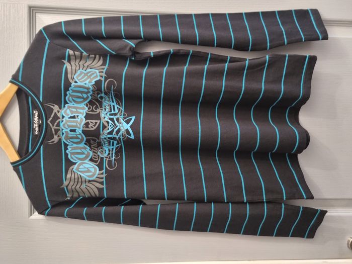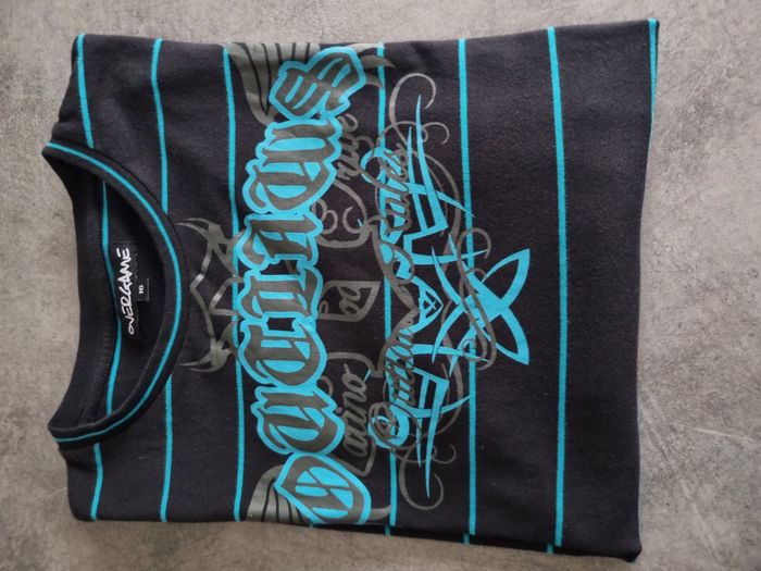T-shirt de marque "Overgame" Noir à rayures bleues manches longues Col rond Flocage sur le devant 95% coton 5% élasthanne Taille 16 ans Très bon état À retirer sur place ou frais de port à votre charge Pour voir d'autres affaires : #fred5129_affaires_manches_longues Pour voir d'autres affaires : #fred5129_16ans