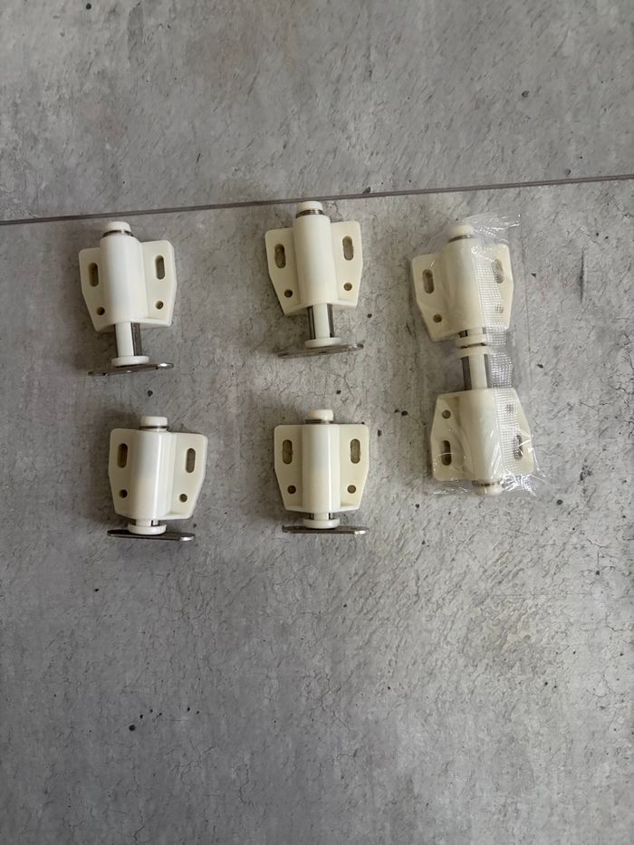 Je vends ce lot de 6 loquets d'armoire aimantés. - Type de produit : Loquet d'armoire - Quantité : 6 loquets - Matière : Plastique blanc - Fonctionnalité : Aimantés - Bouton poussoir invisible - Dimensions : fermé environ 46 mm, ouvert environ 56 mm Très bon état. N'hésitez pas à me contacter pour plus d'informations. Envoie rapide et soigné
