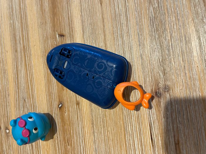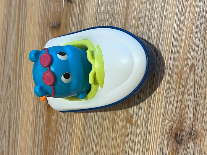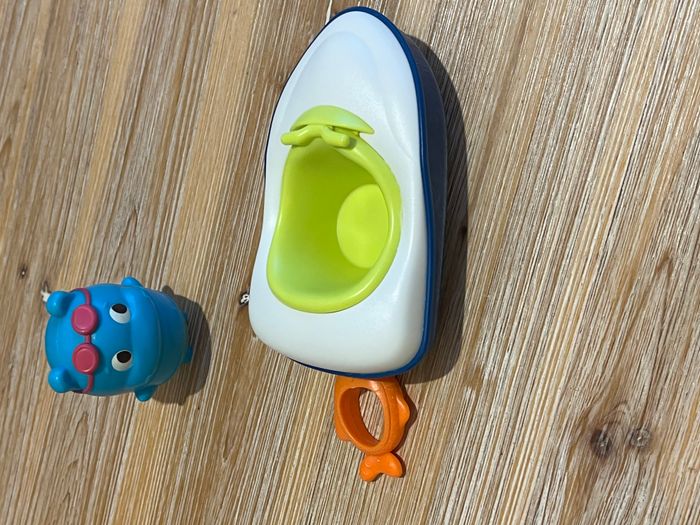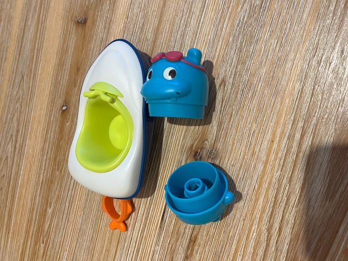 En très bon état. Jeu de bain A beaucoup plus à ma fille. Dès 10 mois. Un bateau de bain flottant avec un capitaine Hippo amovible pour transformer chaque bain en aventure joyeuse. Bateau qui flotte sur l’eau et qui avance tout seul après avoir tiré sur la ficelle Facile à nettoyer, (l'hippo se dévisse pour sécher) conçu en plastique ABS robuste. Dimensions : 11,5 x 18 x 10,5 cm Prix neuf 15,90€