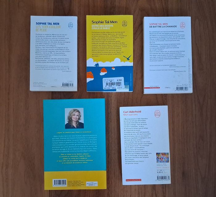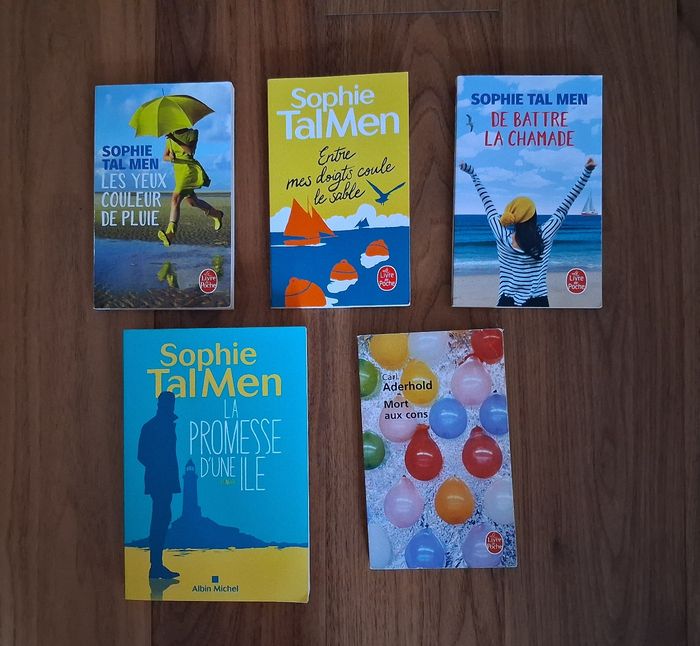 Trilogie des 3 premiers romans de Sophie Tal Men Série Marie Lou En Format poche ✏️ Les yeux couleur de pluie Edition Le livre de poche Prix éditeur : 8,40 € Bon état ✏️ Entre mes doigts coule le sable Edition Le livre de poche Prix éditeur : 8,90 € Très bon état ✏️ De battre la chamade Edition Le livre de poche Prix éditeur : 8,40 € Très bon état ✏️ La promesse d’une île Très bon état Edition Albin Michel Grand format Prix éditeur : 20,90€ ✏️ Mort aux cons Carl Aderhold Edition Le livre de poche Prix éditeur : 6,95 € Bon état N'hésitez pas à me contacter si vous souhaitez des renseignements complémentaires ou compléter le lot. Livraison acceptée Ou remise en main propre possible sur Paris (Bibliothèque François Mitterrand, Gare de Lyon), La Défense, Etampes, etc..