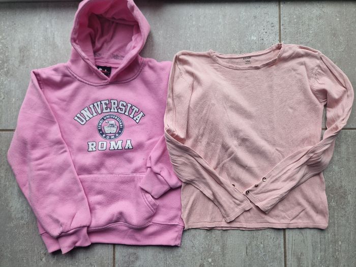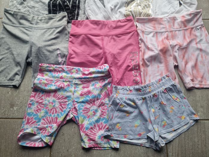 Lot de 20 pièces : -4 t-shirt manches courtes kiabi Le violet a les motifs plus clair sur l'avant d'origine. Le rose a une tache en photo . -1 t-shirt manches 3/4 bronzini , la dentelle est décousue en photo. -1 t-shirt manches longues DPAM, tache en photo NEUF. -1 short kiabi. -4 short Reebok, petit trou sur le gris en photo. -1 gilet la redoute . -1 gilet eden et vidar NEUF. -1 sweat qui vient d'Italie Chip. -1 pull kiabi. -1 pyjama BPC -2 robes BPC -1 robe à fleurs fermée par boutons à l'arrière gémo. -1 robe fermeture à pression à l'arrière orchestra.