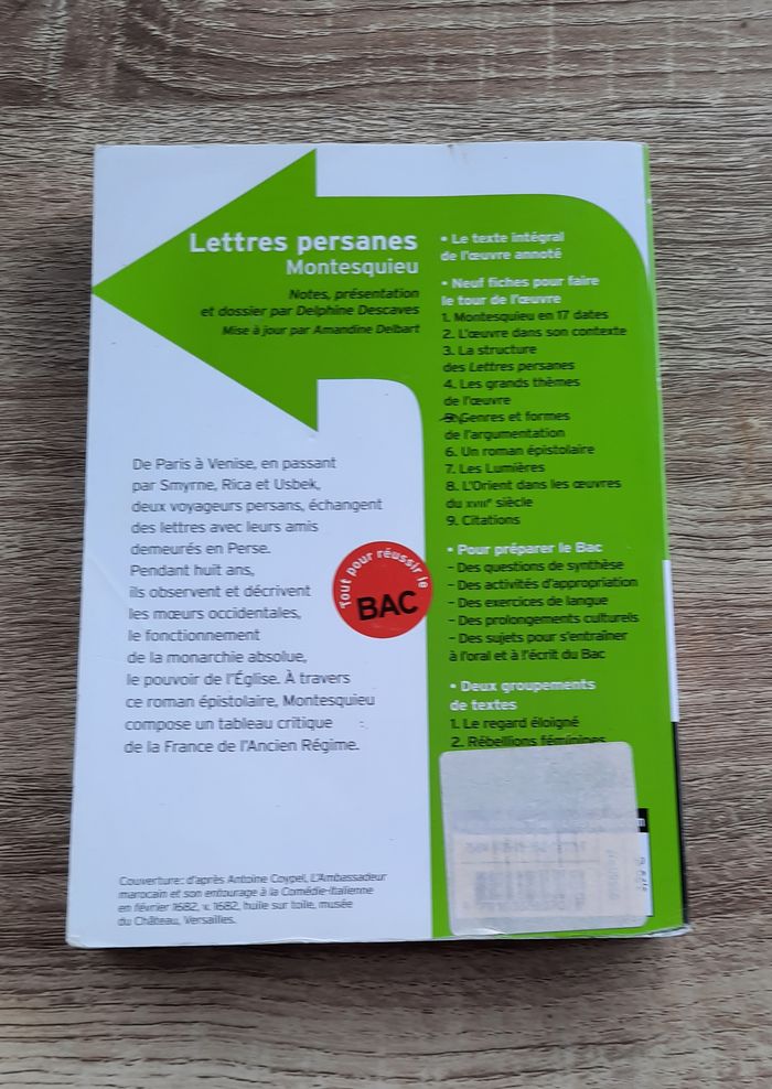 Lettres persannes de Montesquieu De Paris à Venise, en passant par Smyrne, Rica et Usbek, deux voyageurs persans, échangent des lettres avec leurs amis demeurés en Perse. Pendant huit ans, ils observent et décrivent les moeurs occidentales, le fonctionnement de la monarchie absolue, le pouvoir de l'Église. À travers ce roman épistolaire, Montesquieu compose un tableau critique de la France de l'Ancien Régime Le texte intégral de l'oeuvre accompagné de notes de bas de page - Neuf fiches pour faire le tour de l'oeuvre Éditeur ‏ : ‎ BELIN GALLIMARD
