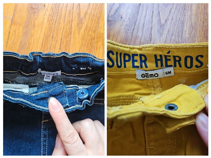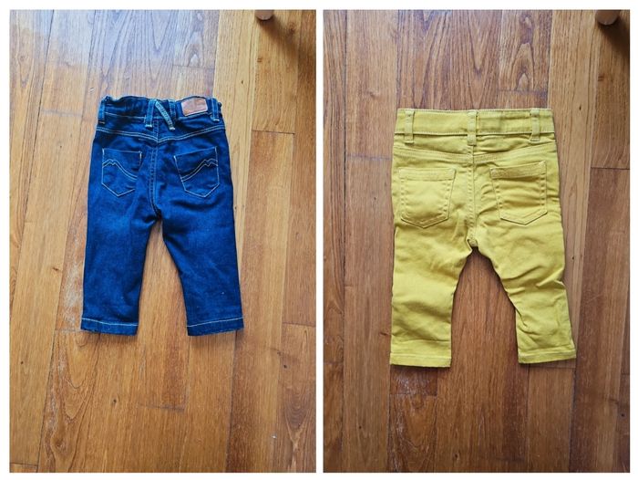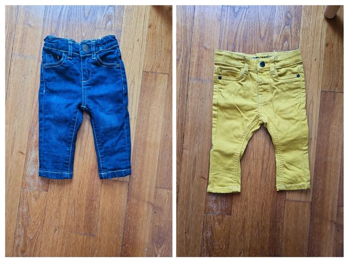 Lot de 2 jeans plutôt slim Un Gémo jaune et un Noukie's bleu marine Parfait état Resserrables au niveau de la taille Taille 6 mois