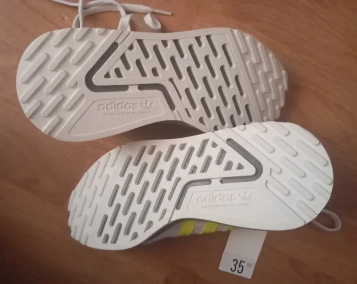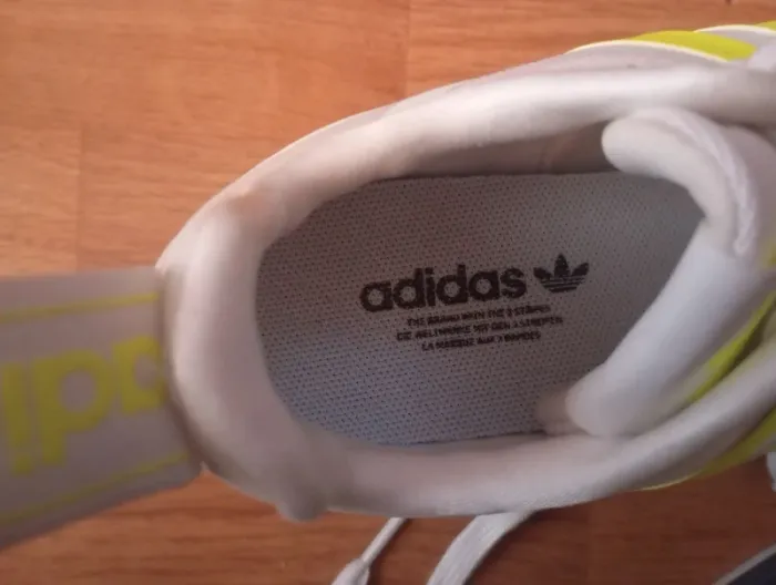 Adidas blanches, bande jaune fluo et semelle grise pointure 35 1/2