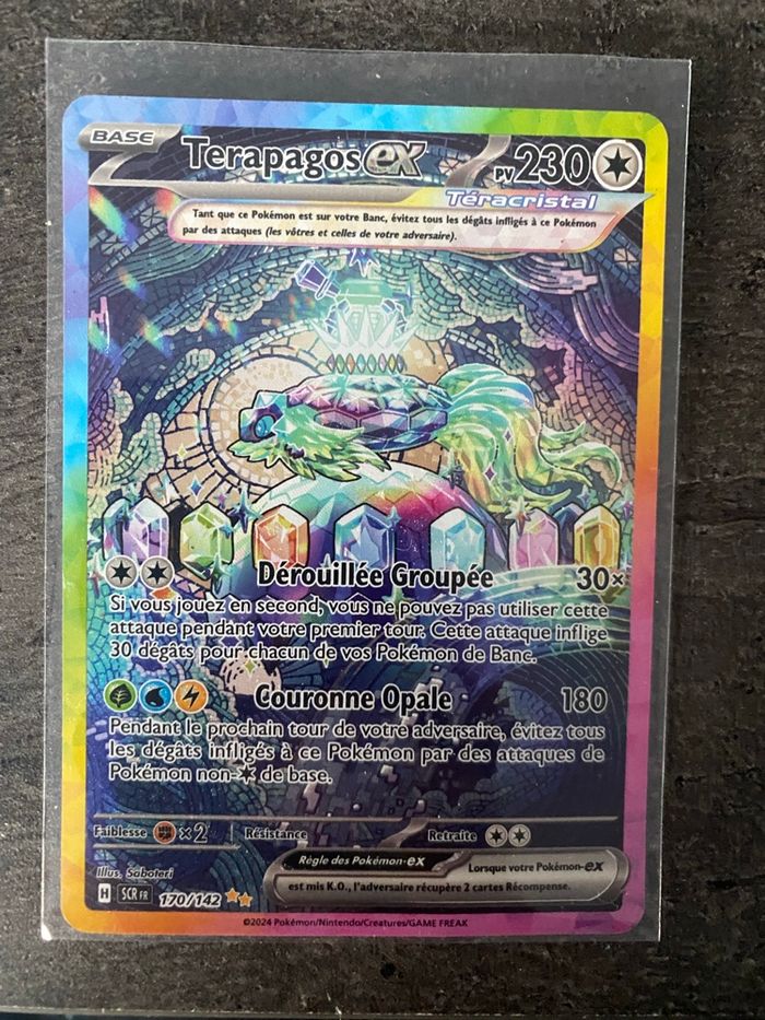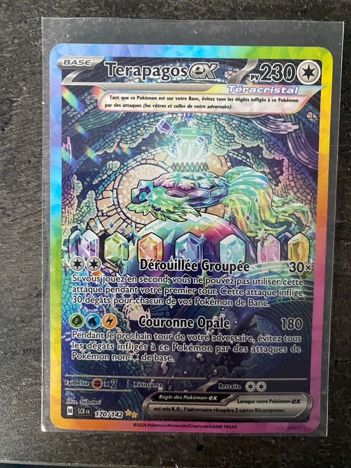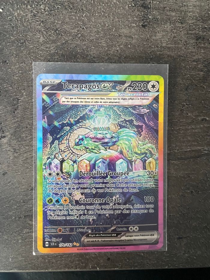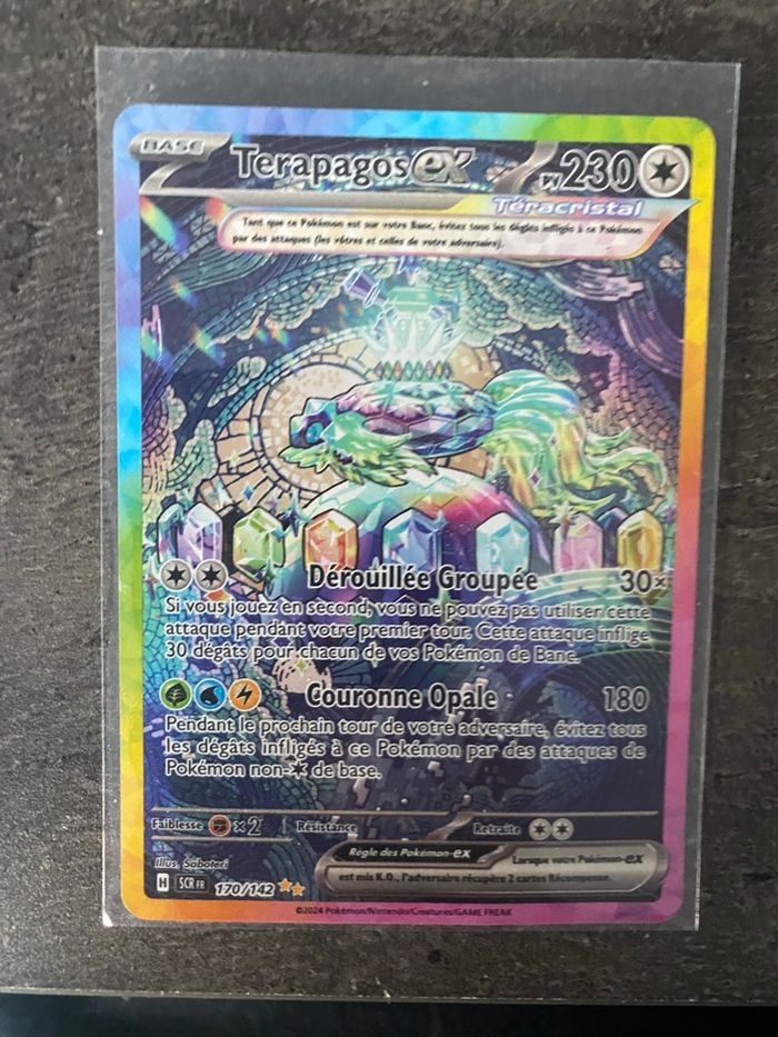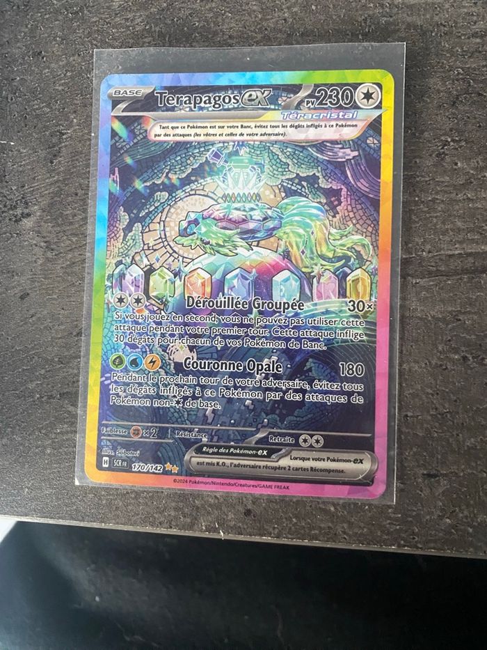 Bonjour Vends carte Pokémon Terapagos 170/142 issu de la série Couronne Stellaire EV07. Carte alternative emblématique de la série Couronne Stellaire. Carte en état satisfaisant, la carte n’est pas parfaitement droite. Prix adapté et inférieur au 1er prix Cardmarket. Idéal classeur. Envoi par livraison ou remise en mains propres secteur 57. Tags : matuvu57 pokemon carte pokemon français tcg alternative pokemon carte Terapagos 170 142 Terapagos ex Terapagos teracristal alt Terapagos Terapagos brillant
