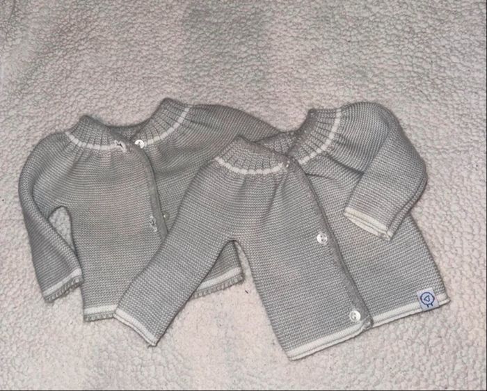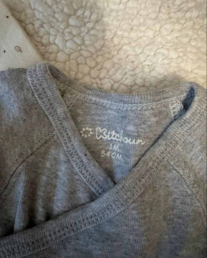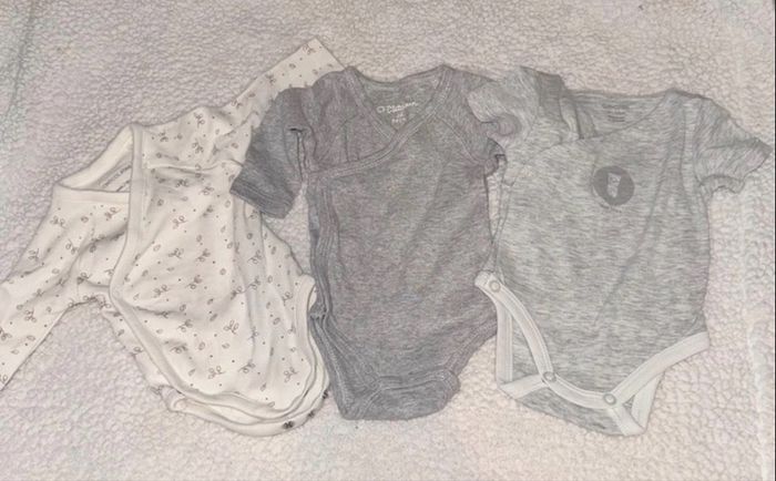 Bonjour, Je vend un lot de vêtements mixte. - 2 bodys manches longs (0-1 mois) - 1 body manche courte (1 mois) - 2 gilets cache cœur (0-1 mois) - Coussin de tête