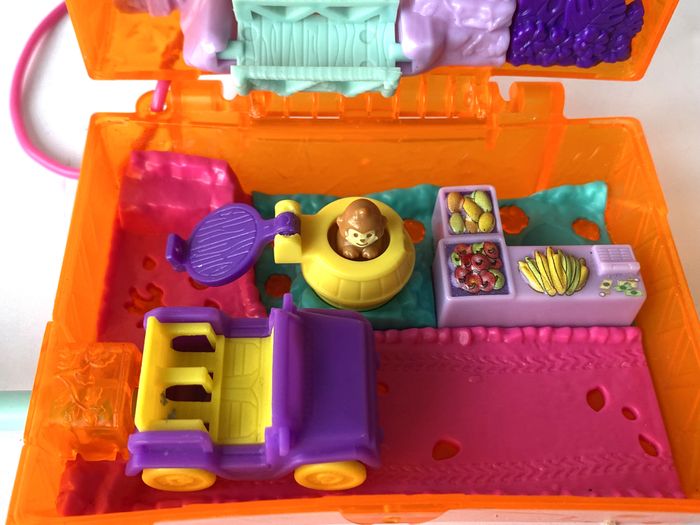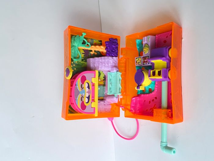 Polly Pocket en forme de brique de jus tropical. Le pont oscille, un bar apparaît en dépliant le totem, en actionnant la paille le véhicule avance et recule, un singe surgit du tonneau. Ce coffret est fourni avec une lanière pour pouvoir le porter autour du poignet. Sans accessoires ni personnages.