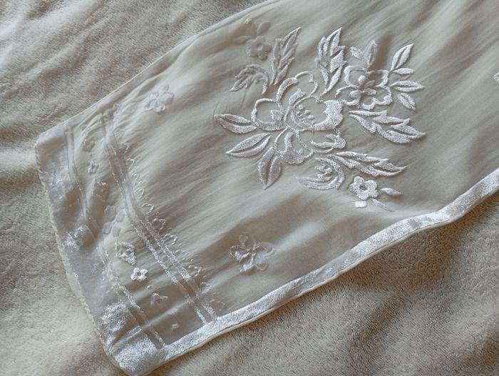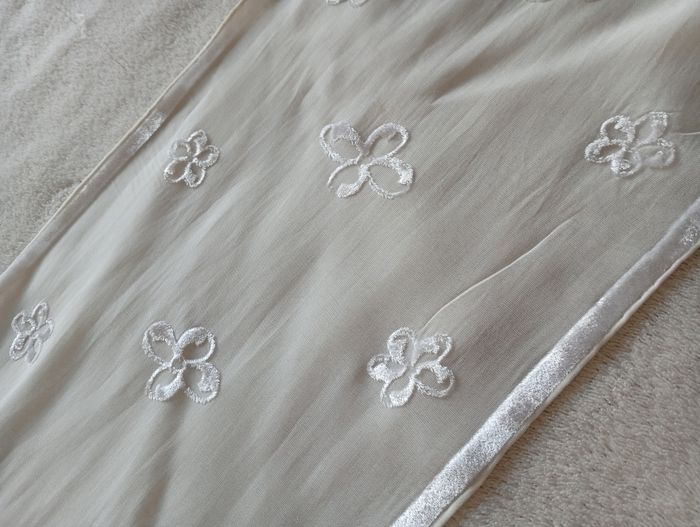 Remise sur lot activé. Foulard ancien couleur blanc en bon état . Conformément aux photos il y a 2 petites trous, pas visibles quand porté. Plus aucune étiquette. Avec du velours en relief pour le motifs . Dimensions approximatives: 130*24cm. #foulardvintage #foulardancien #foulardblanc #foulardvelours