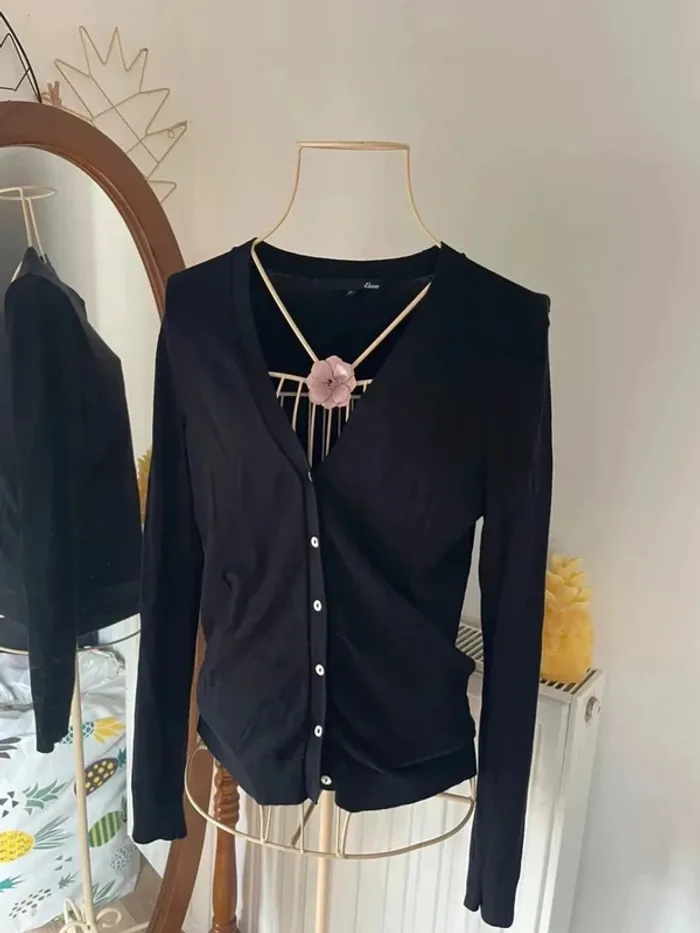 Gilet noir Classique indémodable, c'est un intemporel pour toutes les tenues très élégant avec sa fine maille et sa coupe en V Le gilet se ferme avec des boutons très fins donc discrets Un basique à avoir dans son placard Etam Taille M En parfait état Prix neuf: 29.99€