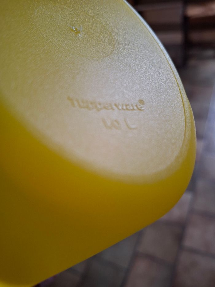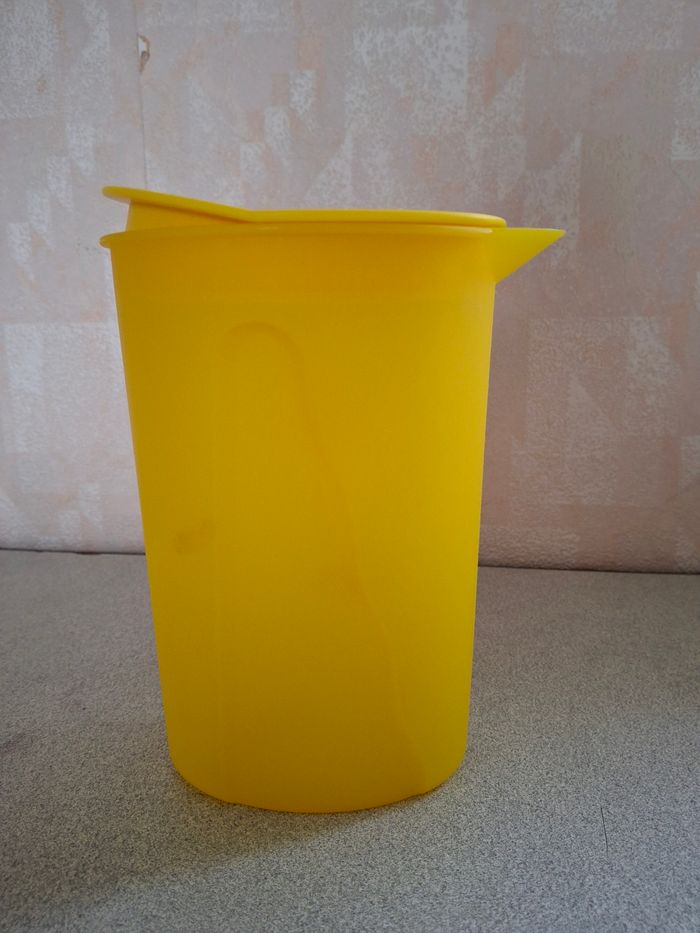 Vends pichet, contenant 1 litre, couleur jaune, en parfait état, avec couvercle. Marque Tupperware, matière : plastique