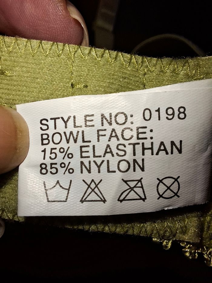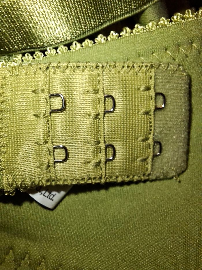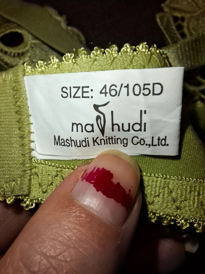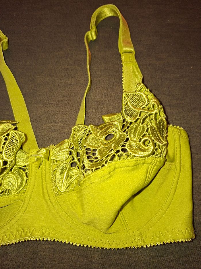 ​À vendre, magnifique soutien-gorge de la marque Mashudi Knitting Co. dans un coloris vert pistache / olive très lumineux et original. ​Détails : Superbe travail de broderie florale et de dentelle guipure sur le haut des bonnets. Petit nœud satiné à l'entre-sein. ​Taille : 105D (FR) / 46D (US/UK). ​Composition : 85% Nylon, 15% Élasthanne (matière stretch et confortable). ​État : Neuf car n’a jamais été porté. Les étiquettes de soin et de marque sont parfaitement lisibles. ​Maintien : Armatures solides et larges bretelles réglables pour un confort optimal. Fermeture par double agrafe à l'arrière (3 niveaux de réglage). ​Un modèle à la fois élégant et robuste, idéal pour les poitrines généreuses qui recherchent du maintien sans sacrifier le style.