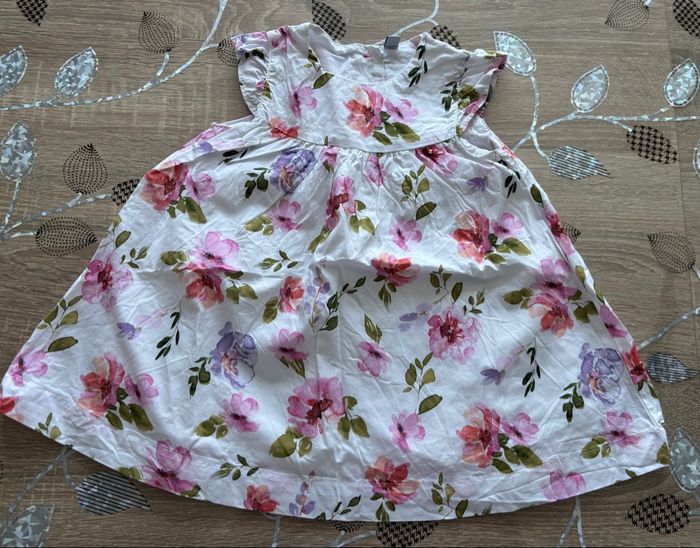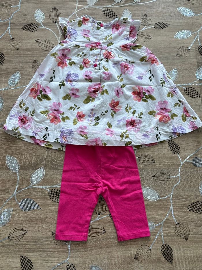 Joli ensemble composé d’une robe blanche à fleurs et d’un legging rose. Confortable et mignon, idéal pour le quotidien. Très bon état Taille : 12 mois