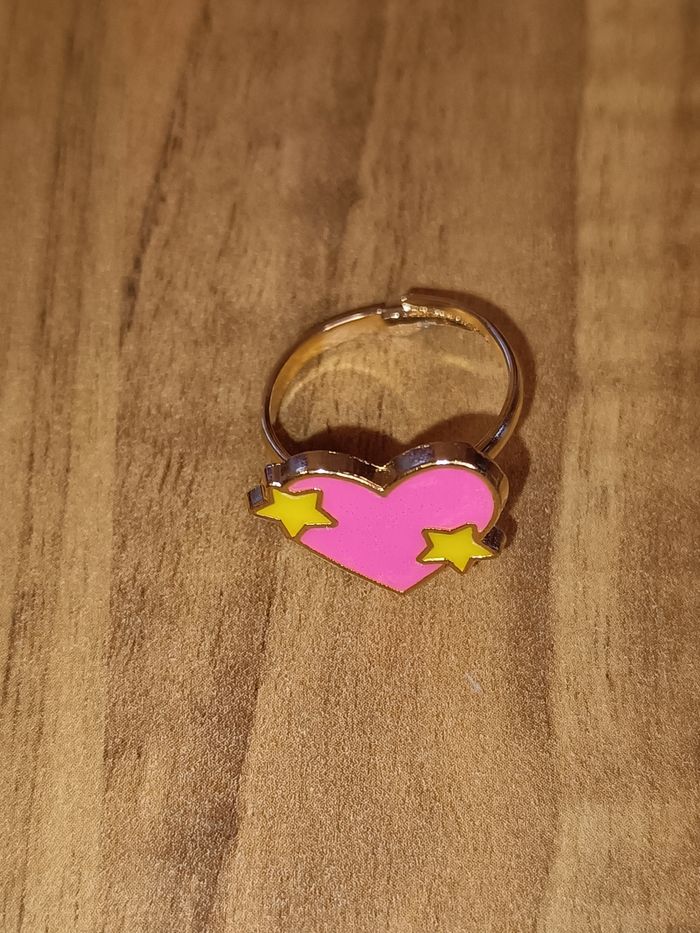 Bague neuve réglable acier doré coeur rose et étoiles jaunes