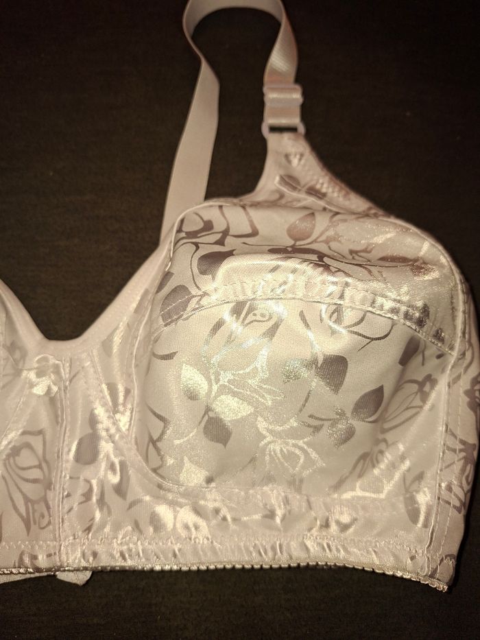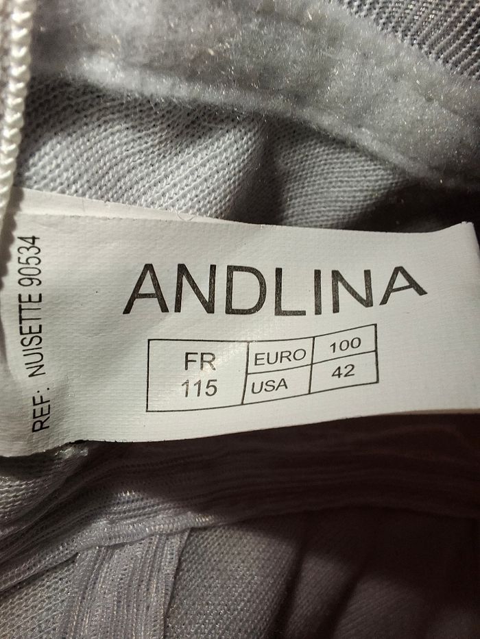 Vends magnifique soutien-gorge de la marque Andlina, coloris blanc nacré avec motifs floraux satinés. ​Type : Emboîtant, sans armatures pour un confort optimal tout au long de la journée. ​Taille : FR 115 (équivalent 100 EUR / 42 USA). ​Bonnet : Estimation D ou E (grande taille). ​Matière : 88% Polyamide, 12% Élasthanne (tissu doux et extensible). ​Détails : ​Larges bretelles réglables pour un bon maintien. ​Fermeture au dos par triple agrafage (2 positions). ​Très joli travail de motifs jacquard brillants. ​État : Excellent état, proche du neuf.