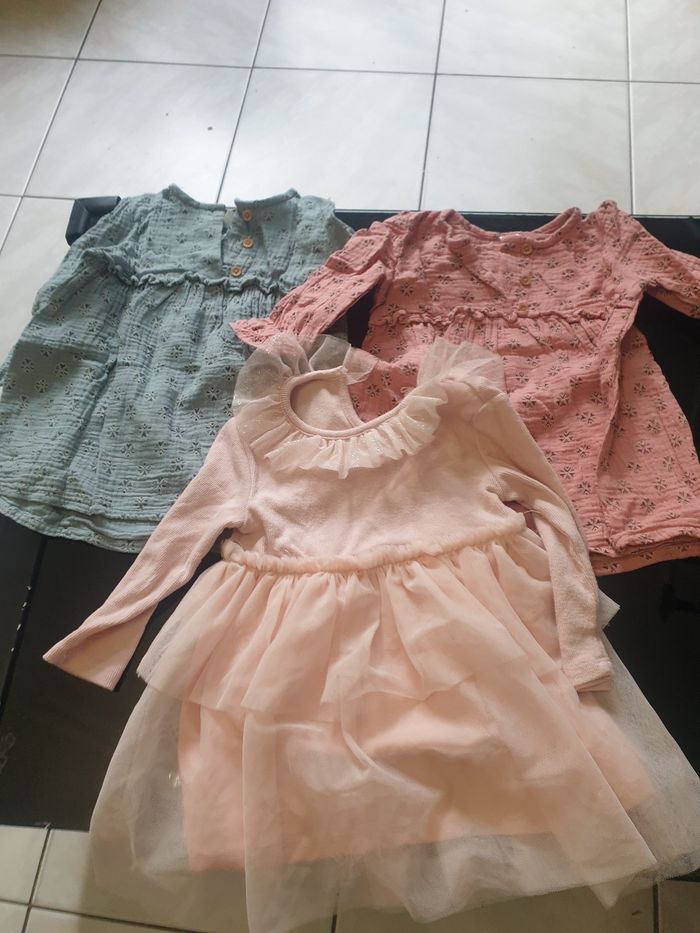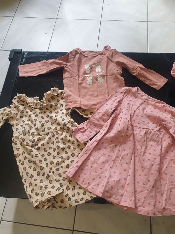 Lot de vêtements 12/18 mois KIABI 18 mois 82cm 🔸️Un short neutre seulement laver 🔸️Un haut manches longues blanc neuf INEXTENSO 12 mois 83 cm ❤Une combinaison de pluie rose neuf ❤Un semblant veste a capuche et jogging léopard et crème ❤2 leggings un bleu marine et un bleu ciel ❤2 robes manches longues. Une léopard avec volant au cou et une rose avec petits cœurs 💕 ❤un haut fin manches longues rose avec petits lapins ❤un pyjama fin violet ❤un pyjama rose cerf velours neuf TEX 18 MOIS 81 CM 💓 3 Pyjamas rose identique 💓un pyjama rose velours 💓un jogging rose 💓jegging bleu marine 💓2 robes manches longues une rose et une verte 💓une robe velours rose poudré ⚠ étiquettes de lavage ont été coupées. Possible présence de bouloches et taches voir photos 📷 Certains vêtements sont neuf ou très bon état d autre bon état