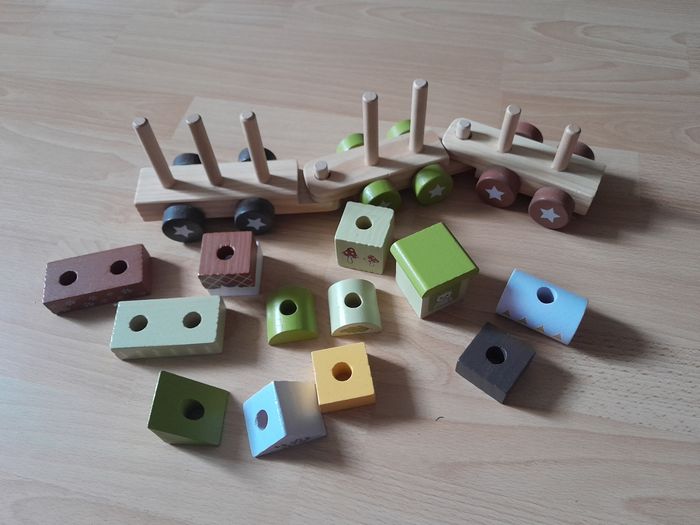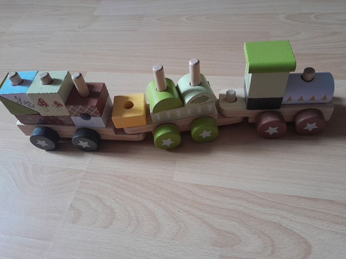 Petit train en bois, empilage des cubes, différentes formes et couleurs