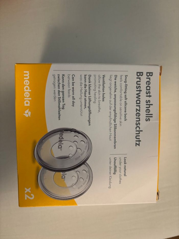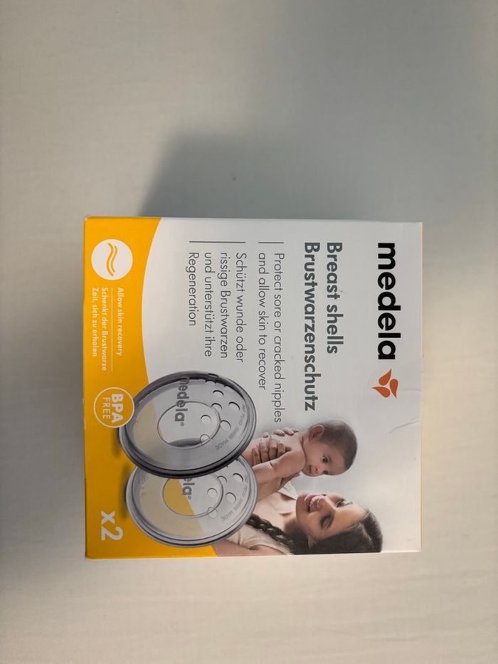 Medela 2 protège mamelons neufs en silicone, pour mamelons abîmés ou crevasses. Peut se porter en continu dans le soutien gorge entre les tétées. Lavés simplement, semblent légèrement jaunis mais jamais utilisés. Vendus dans la boîte d’origine avec notice.