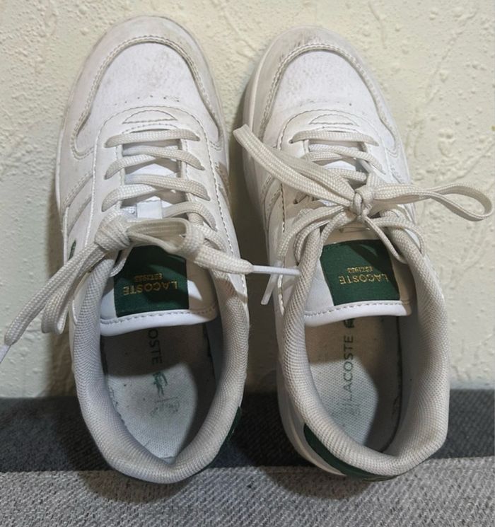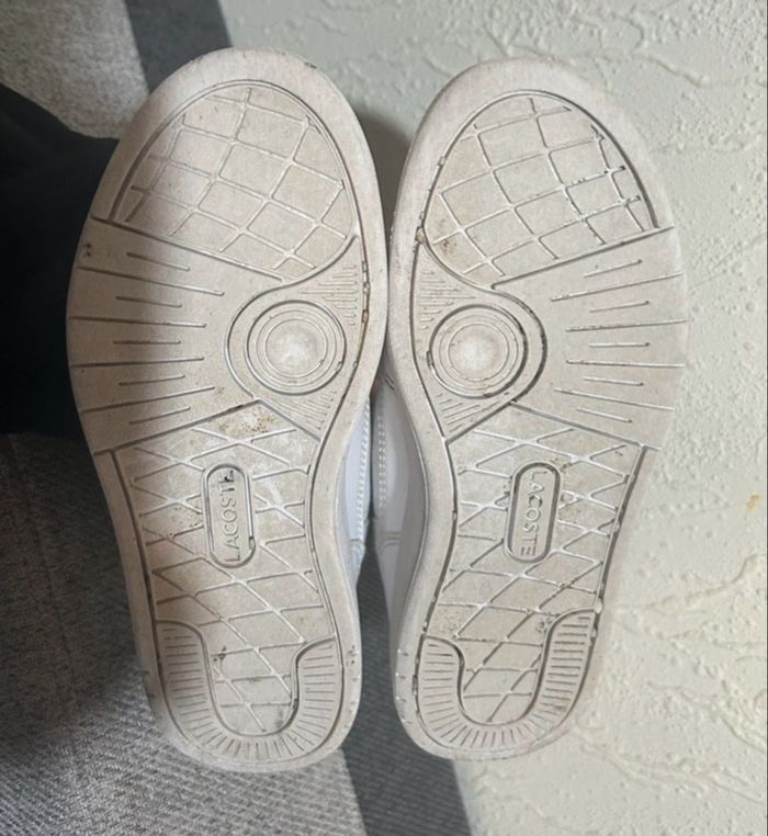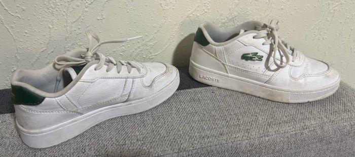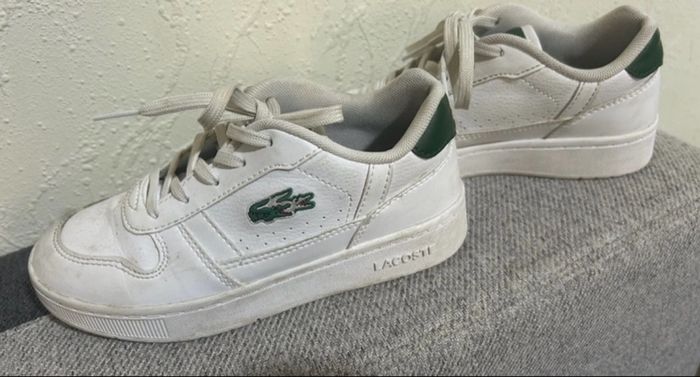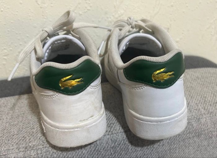 Bonjour À vendre cette jolie paire de baskets blanches et vertes LACOSTE taille 31 Très peu portées juste salies je laverais en machine avant l’envoi bien sûr