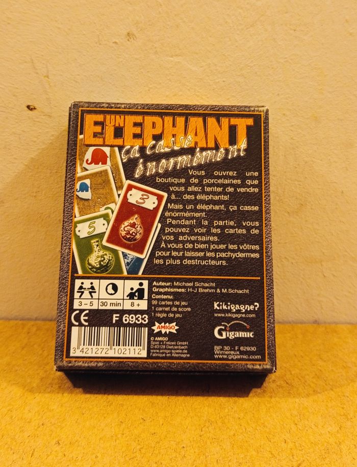 Jeu "Un éléphant, ca casse énormément" Complet très bon état un jeu où l'on collectionne des cartes, en l'occurrence des porcelaines. Malheureusement, ces porcelaines ne sont pas gratuites: il faut dépenser un "billet de banque" pour acheter une carte porcelaine. Curieusement, pour gagner ces billets de banque, il faut inviter un éléphant à se promener dans votre collection de porcelaine, qui détruira toutes les porcelaines d'une couleur ou valeur donnée. En combinant au mieux les achats et destructions de porcelaines, chaque joueur tente de préserver une collection de porcelaine la plus importante possible.
