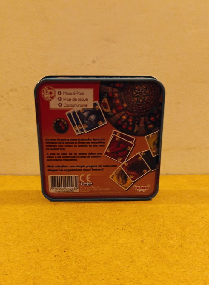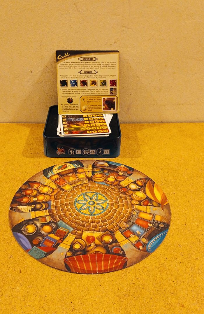 Jeu Souk Au coeur du souk se trouve la place des épices. Les échoppes qui la bordent se livrent une compétition acharnée pour vendre les produits les plus rares au meilleur prix. Les joueurs doivent faire en sorte que les épices soient en plus grand nombre dans le souk. En effet, la valeur en Dirhams de celles-ci est fixée en fonction de leur quantité. À la fin des quatre manches, le joueur qui a le plus de Dirhams est le vainqueur. À vous de miser sur les bonnes épices sans laisser à vos concurrents le temps de conclure leurs propres transactions ! Manque juste le jeton "premier joueur" sinon complet