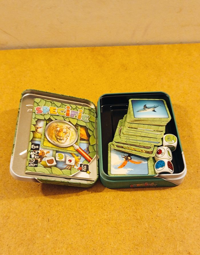 Jeu Specific Gigamic Connaissez-vous un animal omnivore qui a 2 pattes et qui vole ? Lancez les dés et soyez le premier à désigner l’animal qui recoupe les trois caractéristiques annoncées : environnement, alimentation et nombre de pattes. Des variantes rendent le jeu accessible et adapté à toutes les tranches d’âge. Specific est un jeu qui ne se contente pas d’être pédagogique. Il est surtout super drôle et dynamique ! Complet très bon état