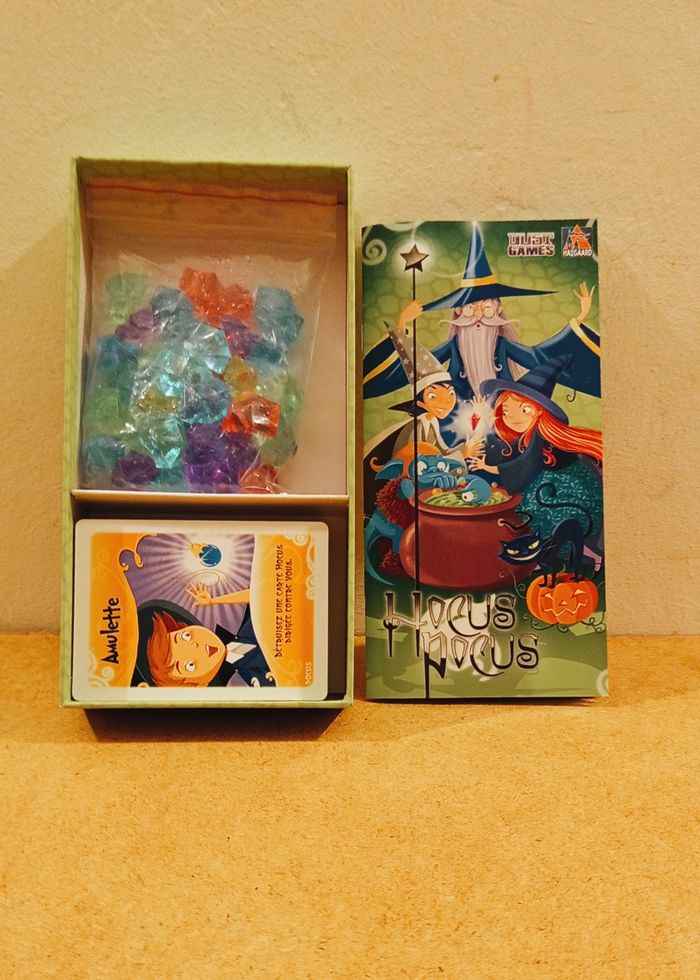 Jeu Hocus Pocus Complet très bon état Le jeu vous propose un duel, voire une bataille générale, entre magots pour le contrôle de gemmes magiques. Pour mettre une bonne pâtée aux collègues adeptes de la baguette magique, les joueurs vont disposer de cartes, trois posées face visible et les autres dans leur main. Ainsi, les autres sorciers connaissent en partie le jeu adverse tout au long de la partie.