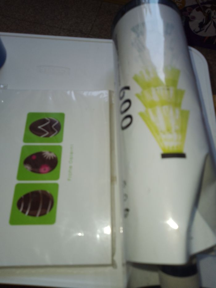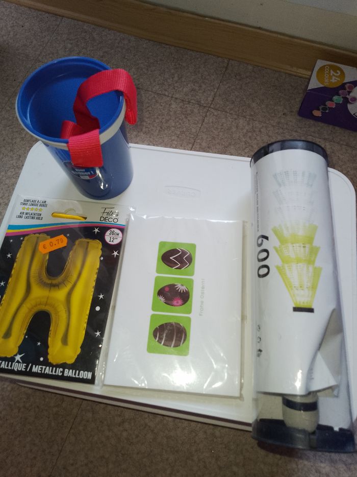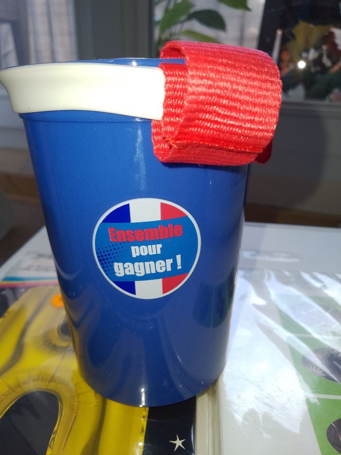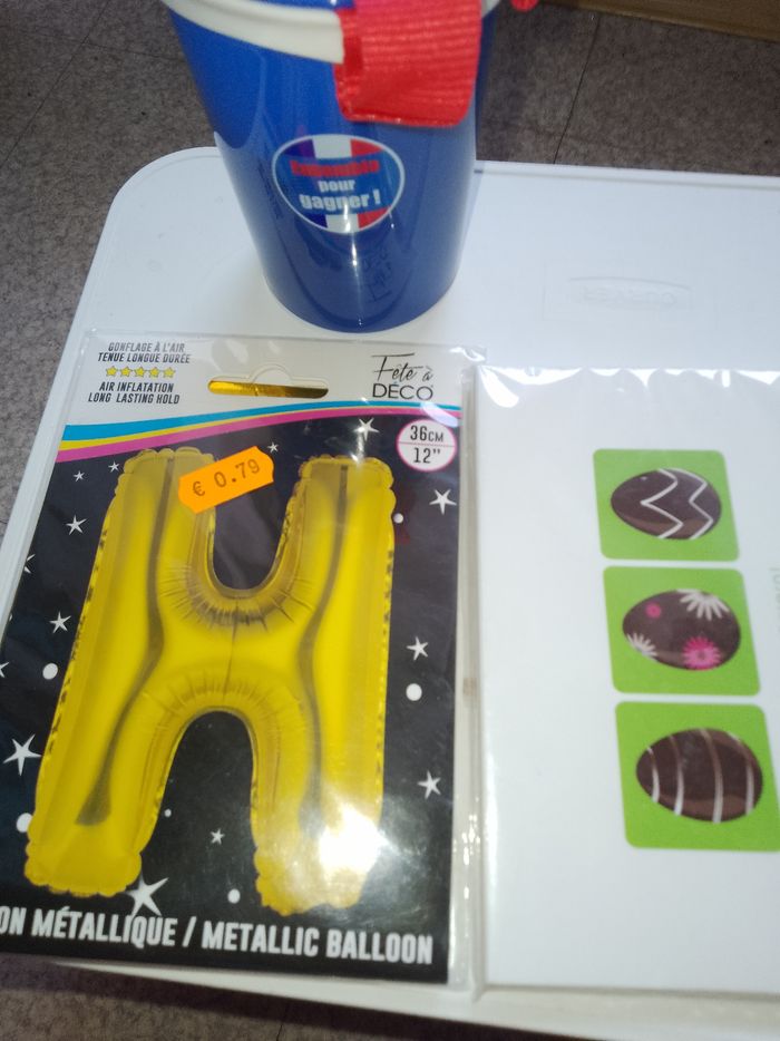 Un gobelet bleu en plastique. PSG, un ballon H gonflable et des cartes de Pâques