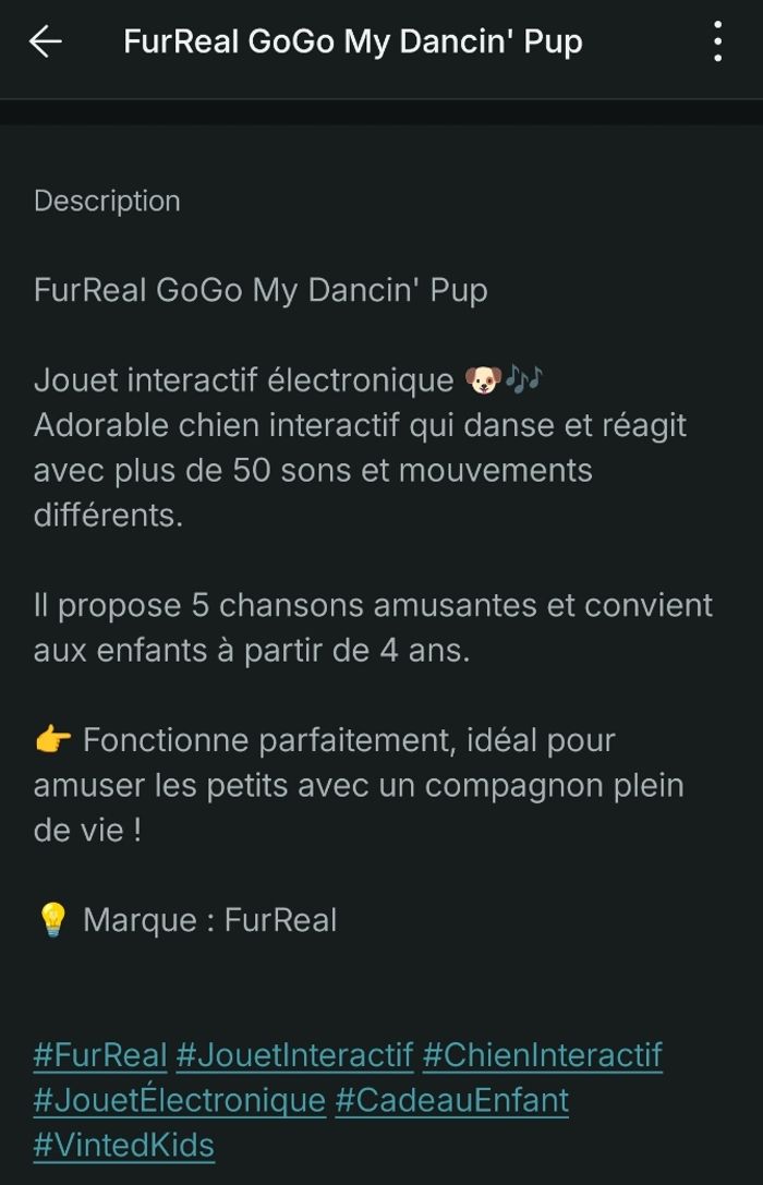 FurReal GoGo Dancing Pup État : Excellent Marque : FurReal (Hasbro) Modèle : GoGo Dancing Pup Fonctionnel Adorable chiot interactif FurReal GoGo Dancing Pup, aussi appelé Beebs, qui danse et s’anime au son de la musique ! Il réagit au toucher, bouge la tête, les pattes et balance la queue. Idéal pour les enfants de 4 ans . Ce compagnon joueur est parfait pour stimuler l’imagination des enfants et ajouter une touche d’animation à leurs jeux.