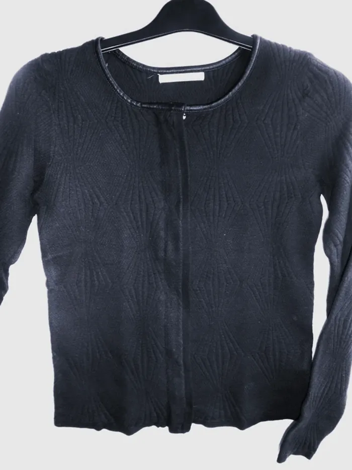 Joli Gilet CAMAÏEU - T. S Maille relief avec biais encolure façon cuir Fermeture sous patte Couleur marine Coton et viscose Beau modèle façon couture Excellent état