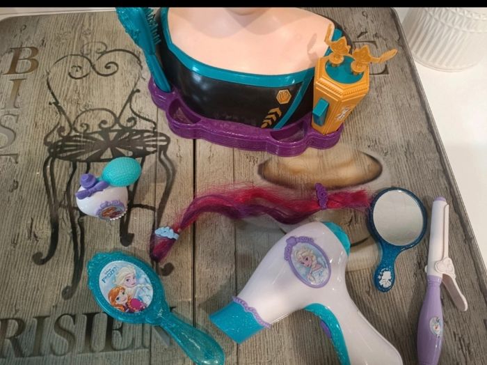 Tête à coiffer Reine des Neiges – Anna Disney + accessoires . Idéale pour les enfants qui aiment coiffer, brosser et s’amuser à créer des coiffures. ✨ Contenu : Tête à coiffer Anna Couronne Sèche-cheveux jouet Brosse Miroir Flacon Accessoires coiffure (voir photos) 💡 État : bon état général . 📸 Photos réelles – vendue conforme aux images. 🎁 Parfait pour cadeau ou jeu d’imitation.