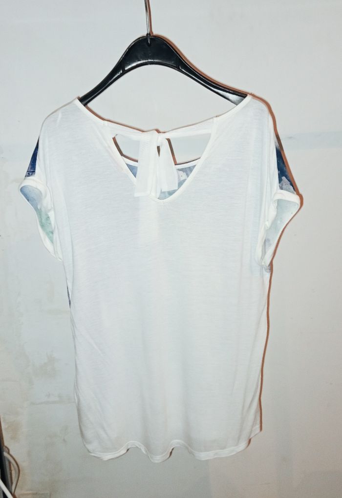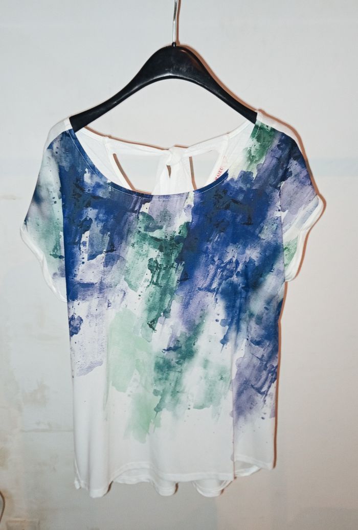 Haut Camaïeu pailleté taille 2 Polyester devant, Viscose au dos Beau dégradé de "peintures" bleues sur le haut avec combinaison de paillettes Très bon état général Noeud à l'arrière